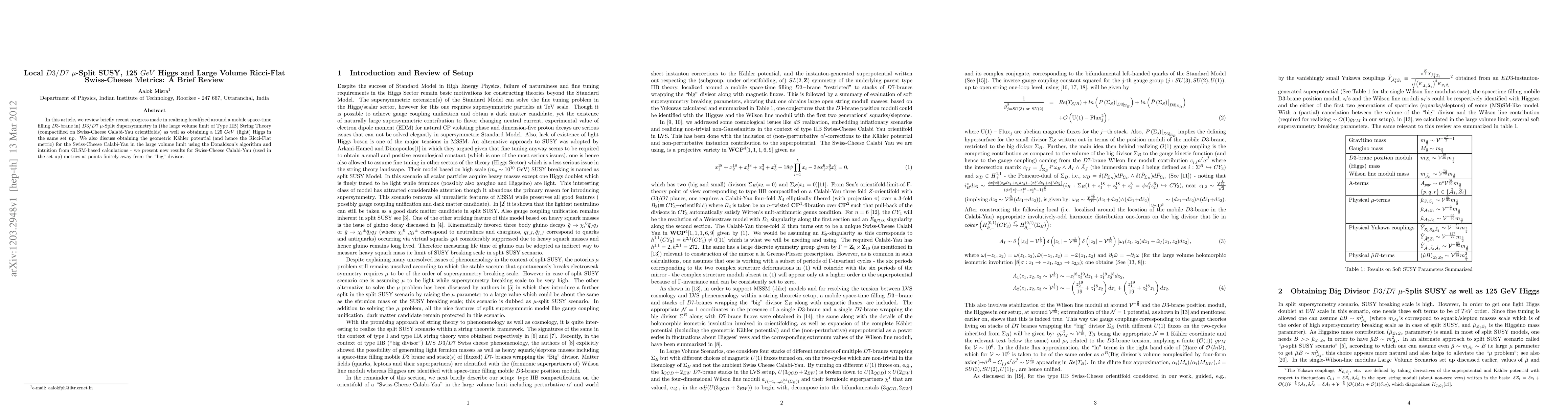 This paper briefly reviews advancements in constructing local D3/D7 mu-Split Supersymmetry within String Theory, achieving a 125 GeV Higgs, and obtaining Ricci-Flat Swiss-Cheese Calabi-Yau metrics in the large volume limit, employing Donaldson's algorithm and GLSM-based calculations. New results detail metrics for Swiss-Cheese Calabi-Yau away from major divisors.