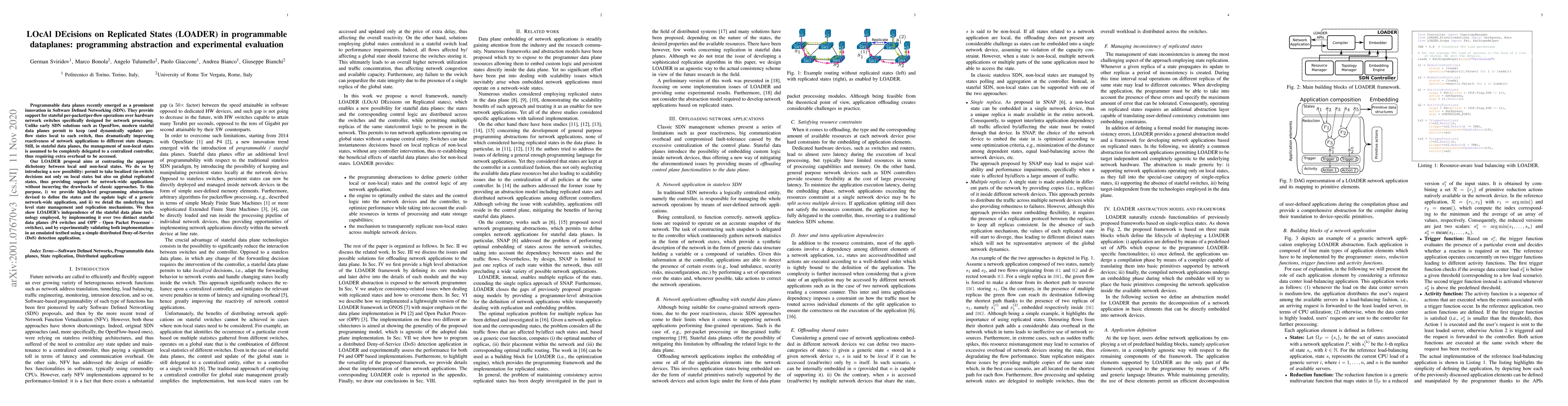 The LOADER proposal introduces local decision-making on replicated global states in programmable data planes to enhance network-wide application performance. It provides programming abstractions and low-level state management mechanisms, and demonstrates its effectiveness through implementations on P4 and OPP switches, validated via a DoS detection application.