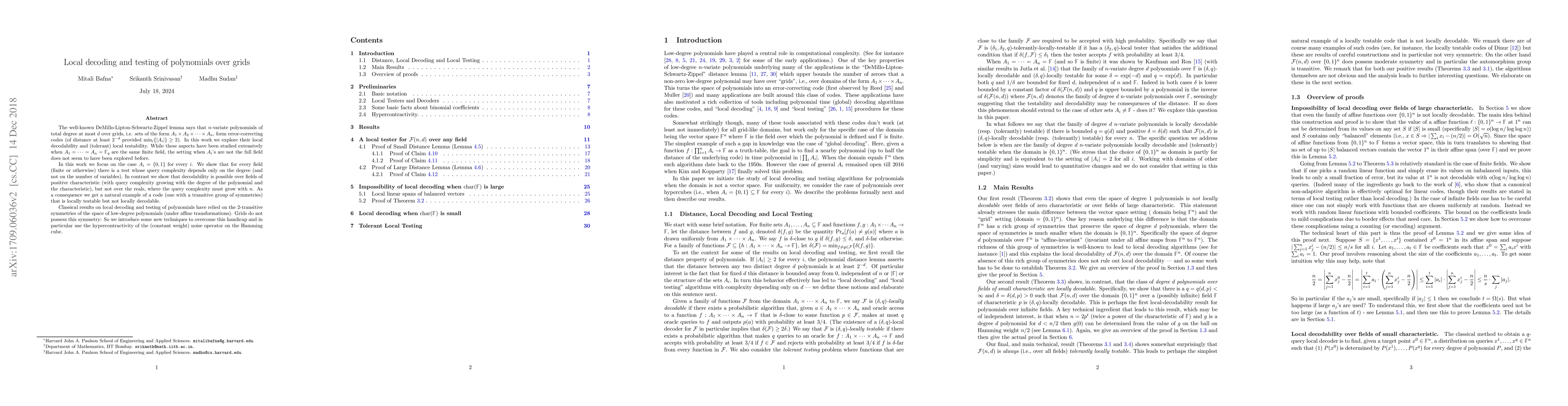 The well-known DeMillo-Lipton-Schwartz-Zippel lemma says that $n$-variate polynomials of total degree at most $d$ over grids, i.e. sets of the form $A_1 \times A_2 \times \cdots \times A_n$, form error-correcting codes (of distance at least $2^{-d}$ provided $\min_i\{|A_i|\}\geq 2$). In this work we explore their local decodability and (tolerant) local testability. While these aspects have been studied extensively when $A_1 = \cdots = A_n = \mathbb{F}_q$ are the same finite field, the setting when $A_i$'s are not the full field does not seem to have been explored before. In this work we focus on the case $A_i = \{0,1\}$ for every $i$. We show that for every field (finite or otherwise) there is a test whose query complexity depends only on the degree (and not on the number of variables). In contrast we show that decodability is possible over fields of positive characteristic (with query complexity growing with the degree of the polynomial and the characteristic), but not over the reals, where the query complexity must grow with $n$. As a consequence we get a natural example of a code (one with a transitive group of symmetries) that is locally testable but not locally decodable. Classical results on local decoding and testing of polynomials have relied on the 2-transitive symmetries of the space of low-degree polynomials (under affine transformations). Grids do not possess this symmetry: So we introduce some new techniques to overcome this handicap and in particular use the hypercontractivity of the (constant weight) noise operator on the Hamming cube.