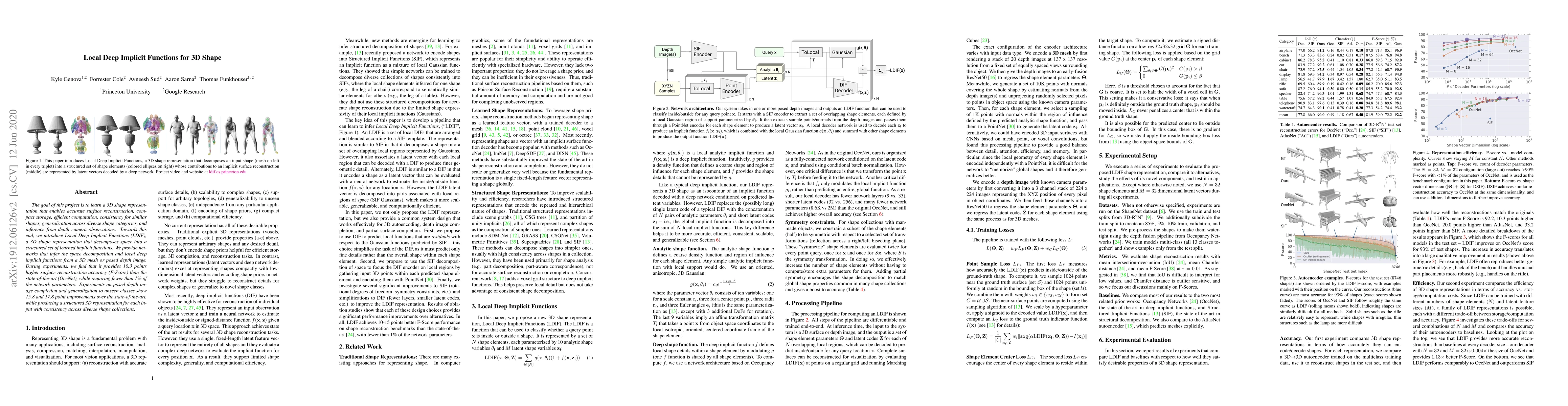 The goal of this project is to learn a 3D shape representation that enables accurate surface reconstruction, compact storage, efficient computation, consistency for similar shapes, generalization across diverse shape categories, and inference from depth camera observations. Towards this end, we introduce Local Deep Implicit Functions (LDIF), a 3D shape representation that decomposes space into a structured set of learned implicit functions. We provide networks that infer the space decomposition and local deep implicit functions from a 3D mesh or posed depth image. During experiments, we find that it provides 10.3 points higher surface reconstruction accuracy (F-Score) than the state-of-the-art (OccNet), while requiring fewer than 1 percent of the network parameters. Experiments on posed depth image completion and generalization to unseen classes show 15.8 and 17.8 point improvements over the state-of-the-art, while producing a structured 3D representation for each input with consistency across diverse shape collections.