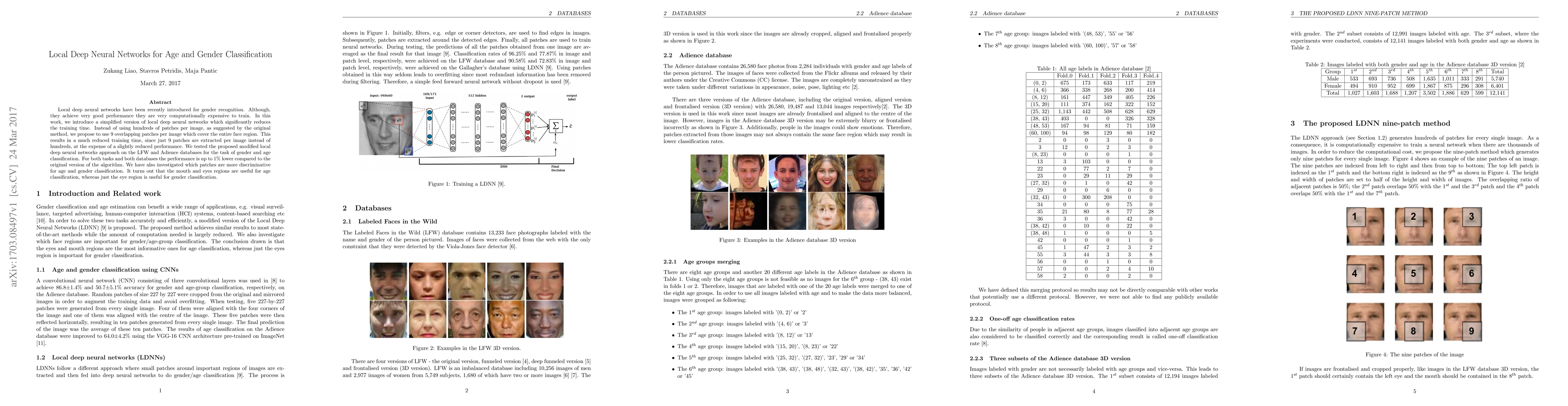 This paper proposes a simplified version of local deep neural networks for gender and age classification that reduces training time by using only 9 overlapping patches per image instead of hundreds, achieving up to 1% lower performance but significantly faster training. The study identifies mouth and eyes regions as key for age classification and the eye region for gender classification.