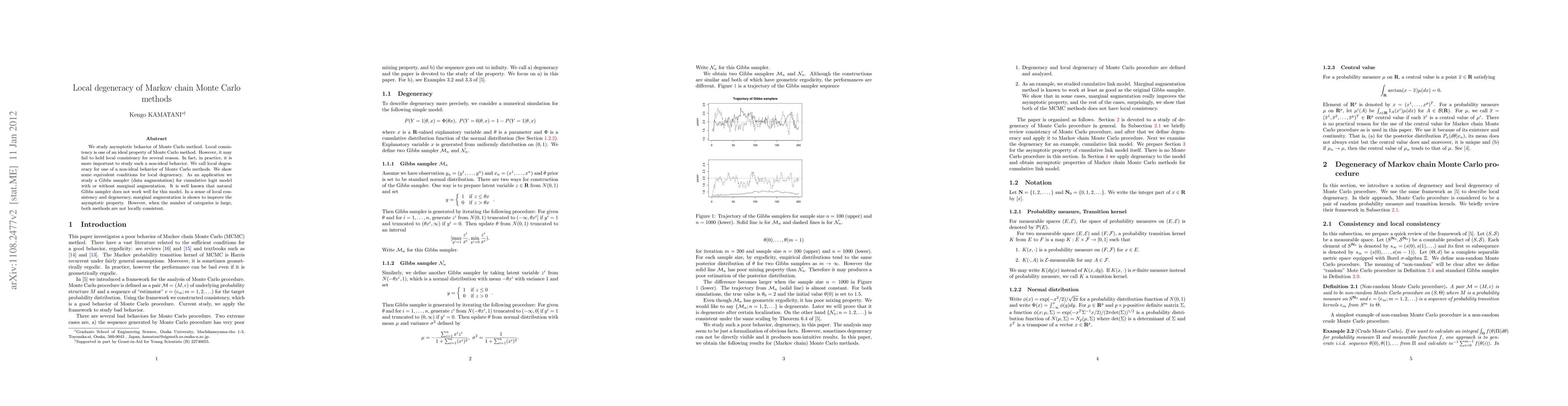 We study asymptotic behavior of Monte Carlo method. Local consistency is one of an ideal property of Monte Carlo method. However, it may fail to hold local consistency for several reason. In fact, in practice, it is more important to study such a non-ideal behavior. We call local degeneracy for one of a non-ideal behavior of Monte Carlo methods. We show some equivalent conditions for local degeneracy. As an application we study a Gibbs sampler (data augmentation) for cumulative logit model with or without marginal augmentation. It is well known that natural Gibbs sampler does not work well for this model. In a sense of local consistency and degeneracy, marginal augmentation is shown to improve the asymptotic property. However, when the number of categories is large, both methods are not locally consistent.
