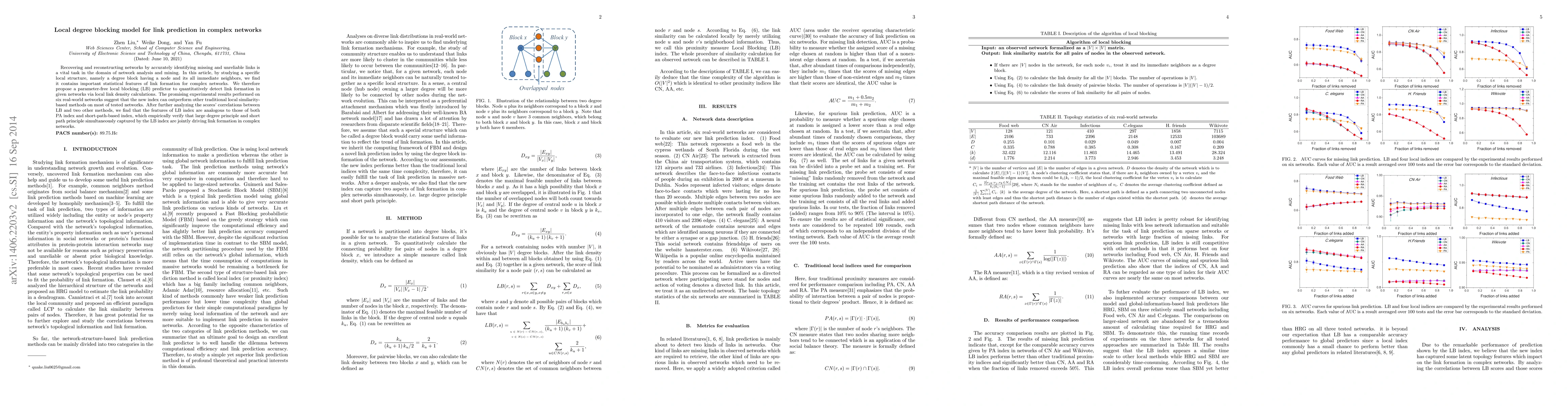 This paper proposes a parameter-free local blocking (LB) predictor for link prediction in complex networks, based on the statistical features of degree blocks. The LB predictor outperforms traditional local similarity methods, and its features align with the large degree and short path principles.