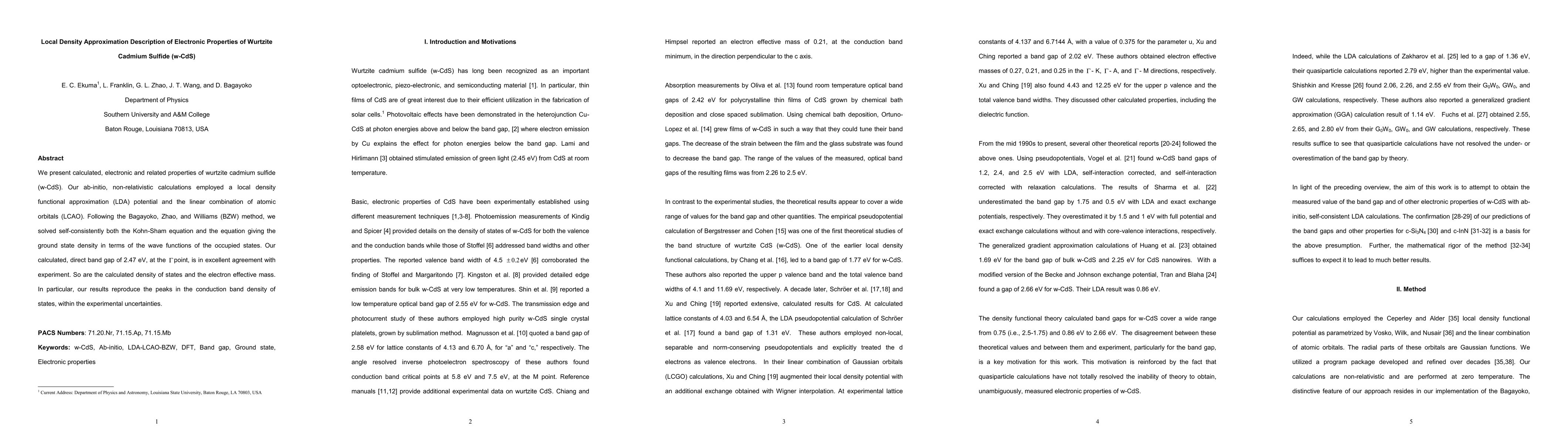 This paper uses ab-initio calculations with local density functional approximation (LDA) to study the electronic properties of wurtzite cadmium sulfide (w-CdS), finding a direct band gap of 2.47 eV that matches experimental data, and accurately reproducing the conduction band density of states.