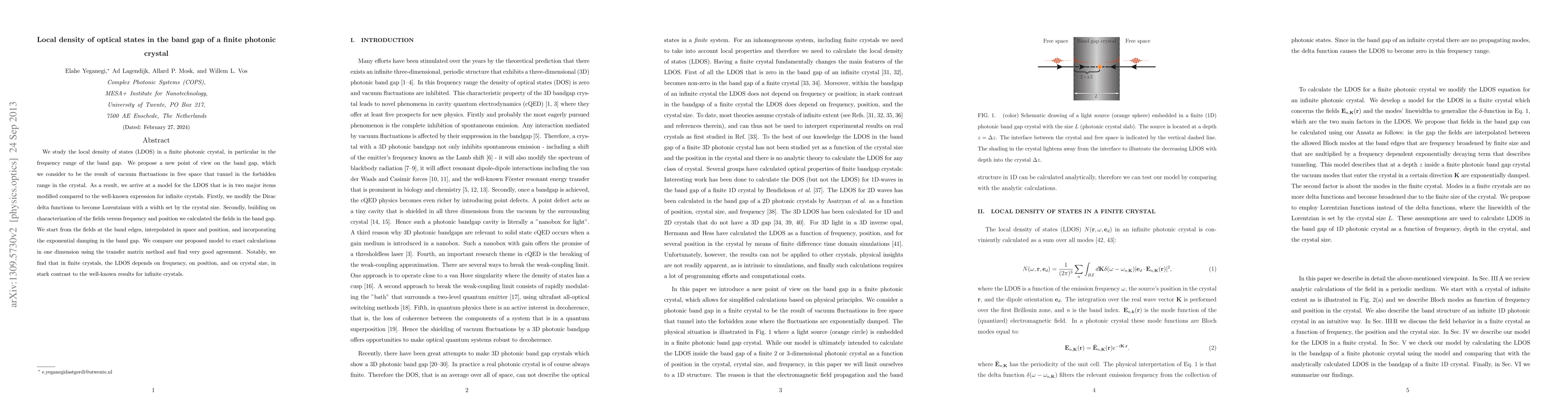 This paper investigates the local density of optical states in the band gap of a finite photonic crystal, proposing a new model that modifies the LDOS expression for infinite crystals by introducing Lorentzians instead of Dirac delta functions and accounting for exponential damping. The model shows good agreement with exact calculations and reveals that the LDOS in finite crystals varies with frequency, position, and crystal size.