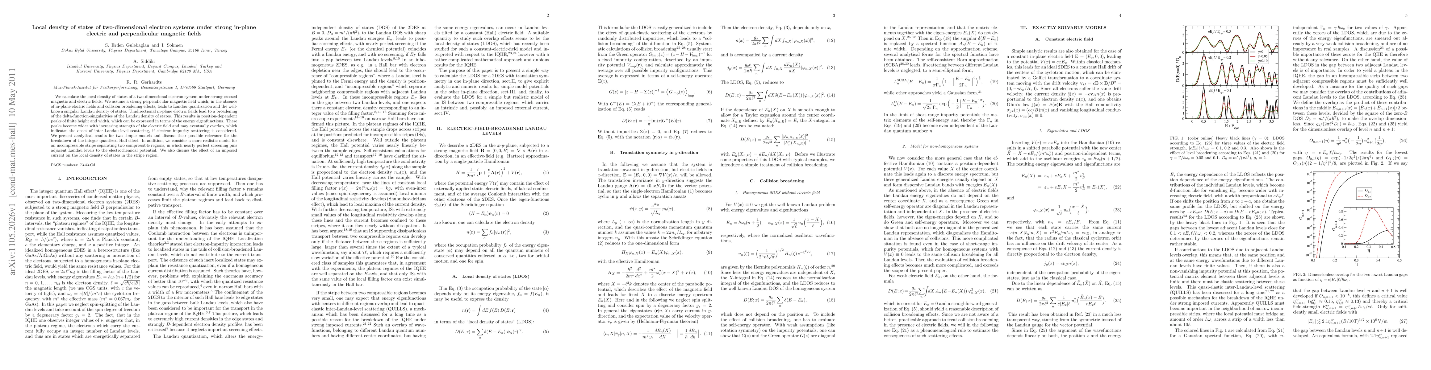 This paper investigates the local density of states in two-dimensional electron systems under strong perpendicular magnetic and in-plane electric fields, revealing how electric fields broaden the Landau levels into finite peaks. It discusses the implications for the breakdown of the integer quantized Hall effect and considers a model of an incompressible stripe with pinned Landau levels.