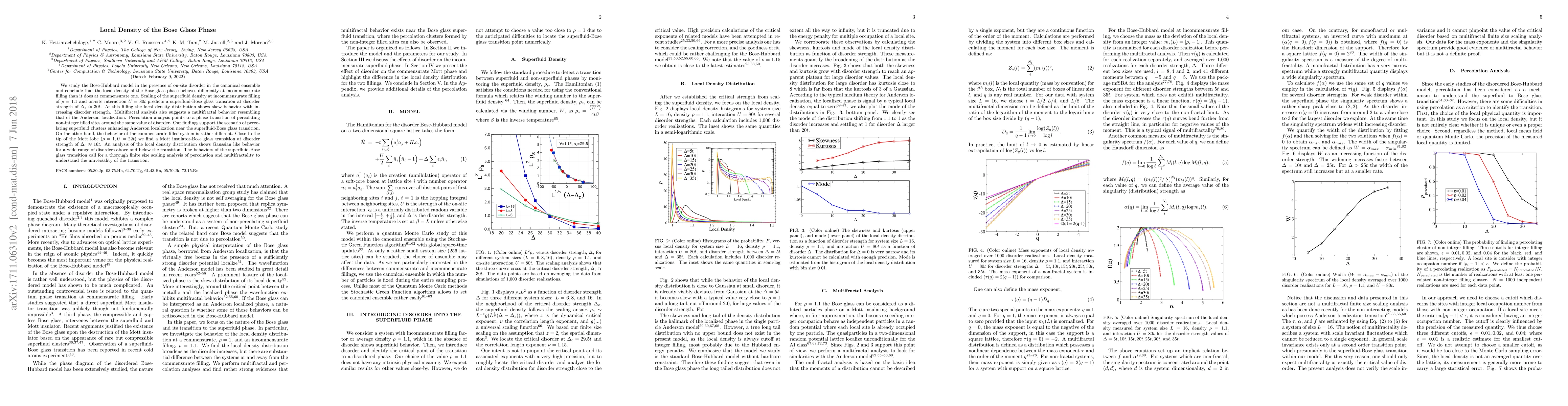 The research investigates the Bose-Hubbard model with disorder, finding distinct local density behaviors in Bose glass phases at incommensurate vs. commensurate fillings. At incommensurate filling (ρ=1.1, U=80t), a superfluid-Bose glass transition occurs at Δc ≈ 30t, exhibiting skew density distribution and multifractal behavior akin to Anderson localization. Percolation analysis reveals a transition of non-integer filled sites. In contrast, the commensurate filled system (ρ=1, U=22t) shows a Mott insulator-Bose glass transition at Δc ≈ 16t, with Gaussian-like local density distribution across various disorders.