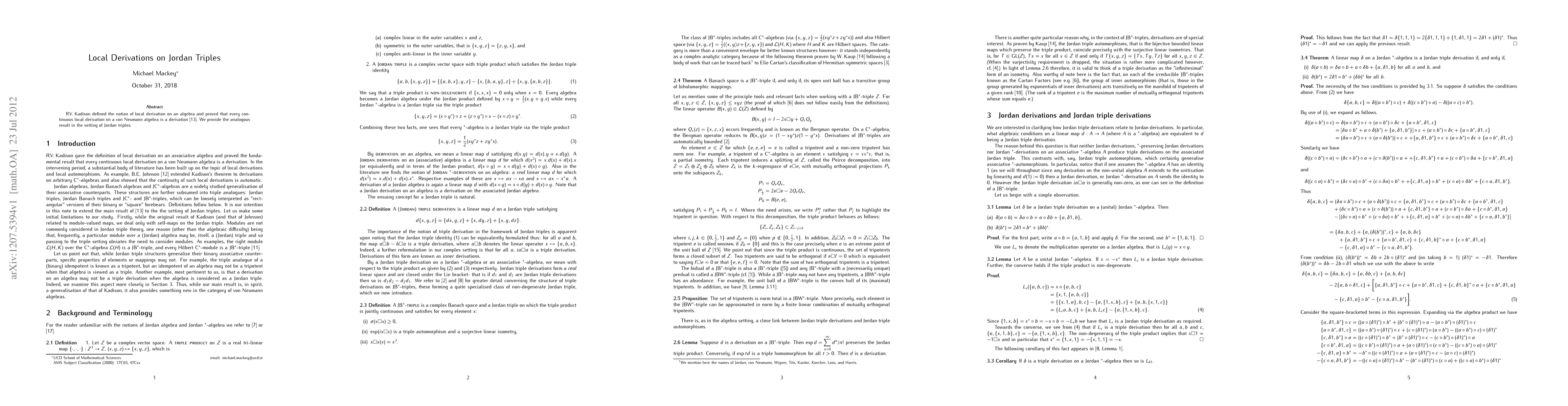 Researchers extend Kadison's work on local derivations to Jordan triples, proving that every continuous local derivation is a derivation in this setting. This contributes to our understanding of algebraic structures with rich properties.