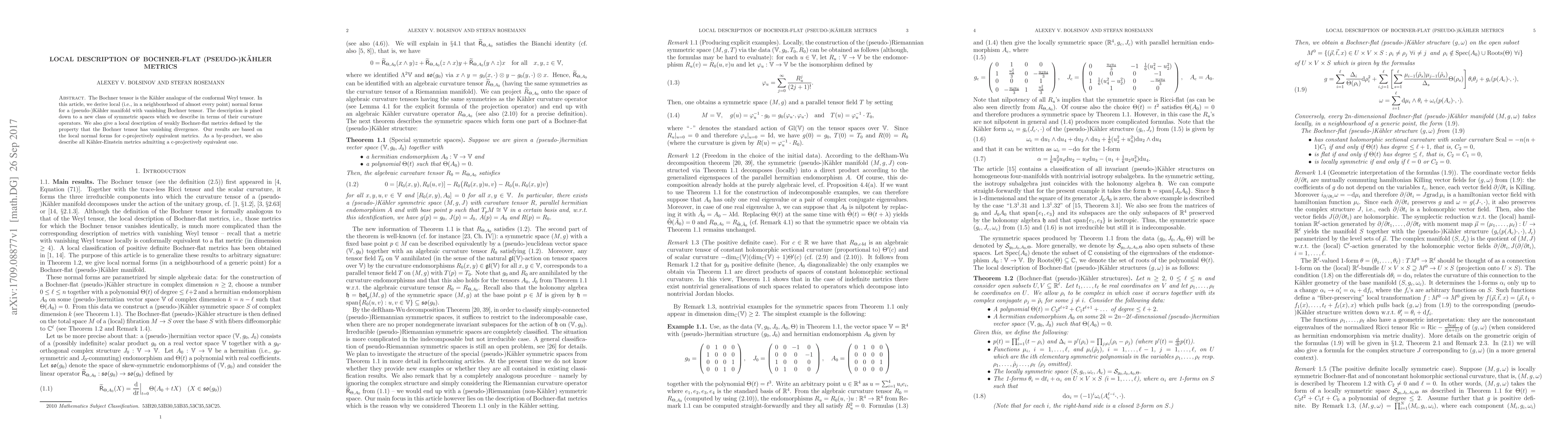 This paper derives local normal forms for (pseudo-)Kähler manifolds with a vanishing Bochner tensor, identifying a new class of symmetric spaces via their curvature operators. Additionally, it provides a local description for weakly Bochner-flat metrics and characterizes Kähler-Einstein metrics that admit c-projectively equivalent ones.