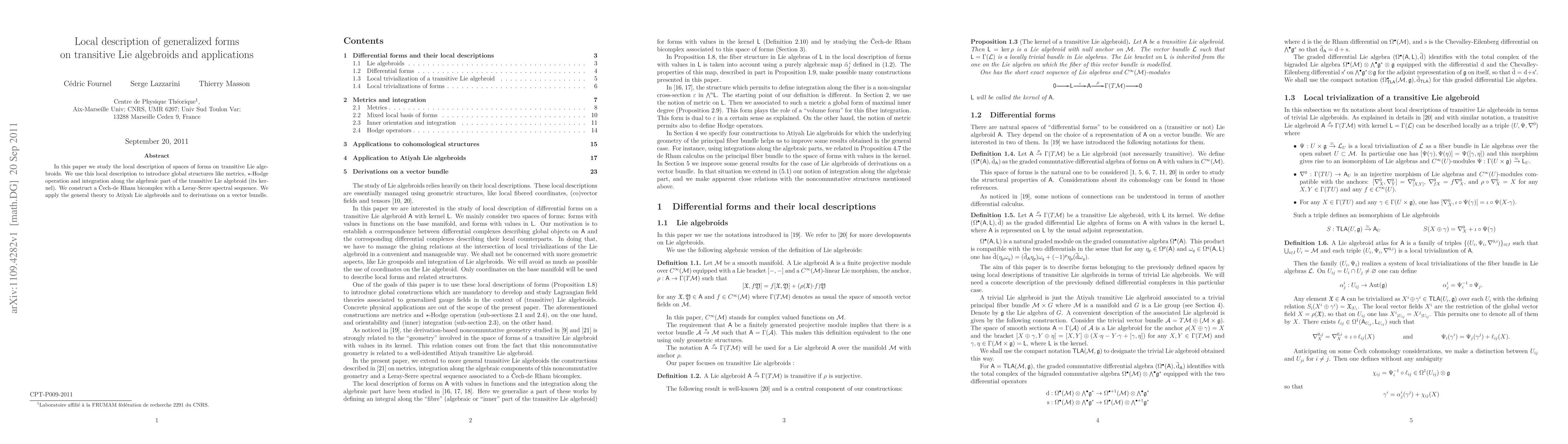 This paper explores the local structure of spaces of forms on transitive Lie algebroids and utilizes this to introduce global structures including metrics and integration. It constructs a \v{C}ech-de Rham bicomplex and applies the developed theory to Atiyah Lie algebroids and vector bundle derivations.