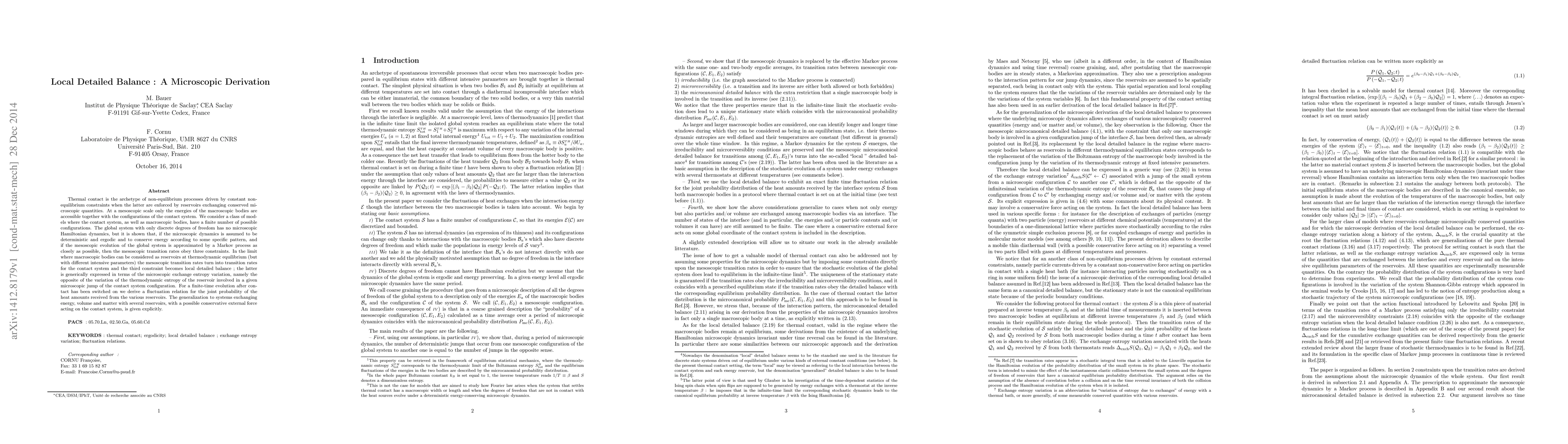 Thermal contact is the archetype of non-equilibrium processes driven by constant non-equilibrium constraints when the latter are enforced by reservoirs exchanging conserved microscopic quantities. At a mesoscopic scale only the energies of the macroscopic bodies are accessible together with the configurations of the contact system. We consider a class of models where the contact system, as well as macroscopic bodies, have a finite number of possible configurations. The global system with only discrete degrees of freedom has no microscopic Hamiltonian dynamics, but it is shown that, if the microscopic dynamics is assumed to be deterministic and ergodic and to conserve energy according to some specific pattern, and if the mesoscopic evolution of the global system is approximated by a Markov process as closely as possible, then the mesoscopic transition rates obey three constraints. In the limit where macroscopic bodies can be considered as reservoirs at thermodynamic equilibrium (but with different intensive parameters) the mesoscopic transition rates turn into transition rates for the contact system and the third constraint becomes local detailed balance ; the latter is generically expressed in terms of the microscopic exchange entropy variation, namely the opposite of the variation of the thermodynamic entropy of the reservoir involved in a given microscopic jump of the contact system configuration. For a finite-time evolution after contact has been switched on we derive a fluctuation relation for the joint probability of the heat amounts received from the various reservoirs. The generalization to systems exchanging energy, volume and matter with several reservoirs, with a possible conservative external force acting on the contact system, is given explicitly.