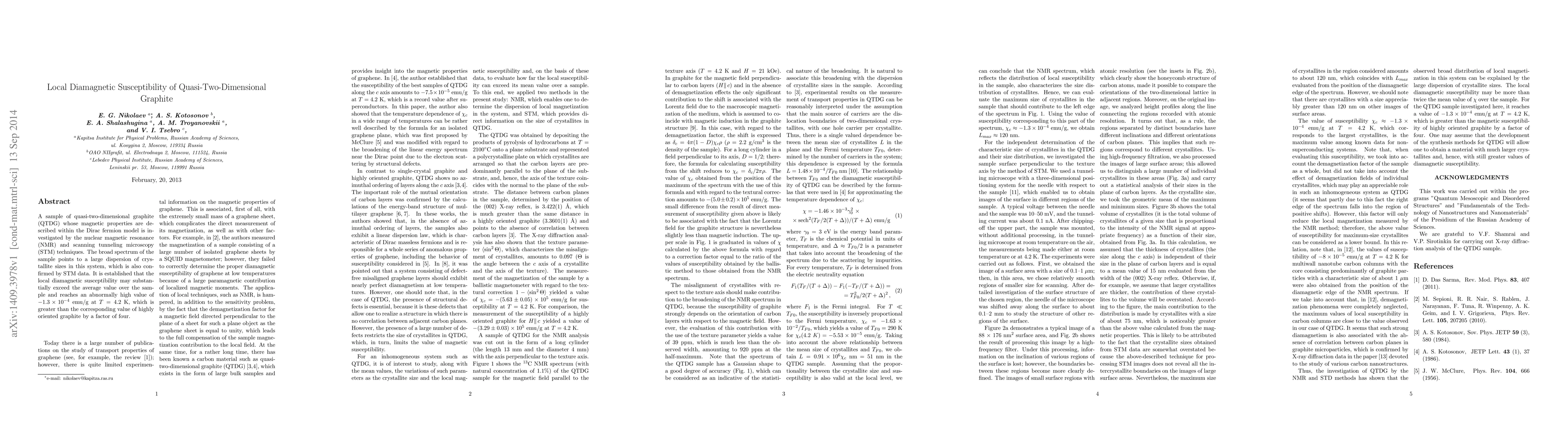 A sample of quasi-two-dimensional graphite (QTDG) whose magnetic properties are described within the Dirac fermion model is investigated by the nuclear magnetic resonance (NMR) and scanning tunneling microscopy (STM) techniques. The broad spectrum of the sample points to a large dispersion of crystallite sizes in this system, which is also confirmed by STM data. It is established that the local diamagnetic susceptibility may substantially exceed the average value over the sample and reaches an abnormally high value of $-1.3\times 10^{-4}$ emu/g at $T = 4.2$ K, which is greater than the corresponding value of highly oriented graphite by a factor of four.