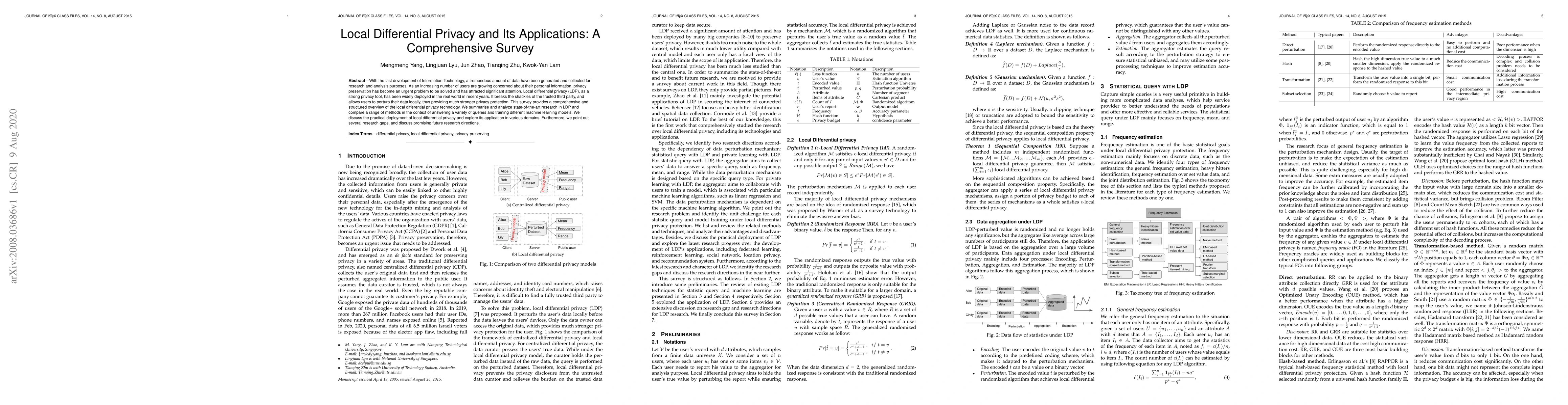 This paper surveys local differential privacy (LDP), a privacy-preserving technique that allows users to protect their data locally without relying on a trusted third party. It provides an in-depth analysis of state-of-the-art LDP methods, their applications in various domains, and discusses future research directions to address existing gaps.