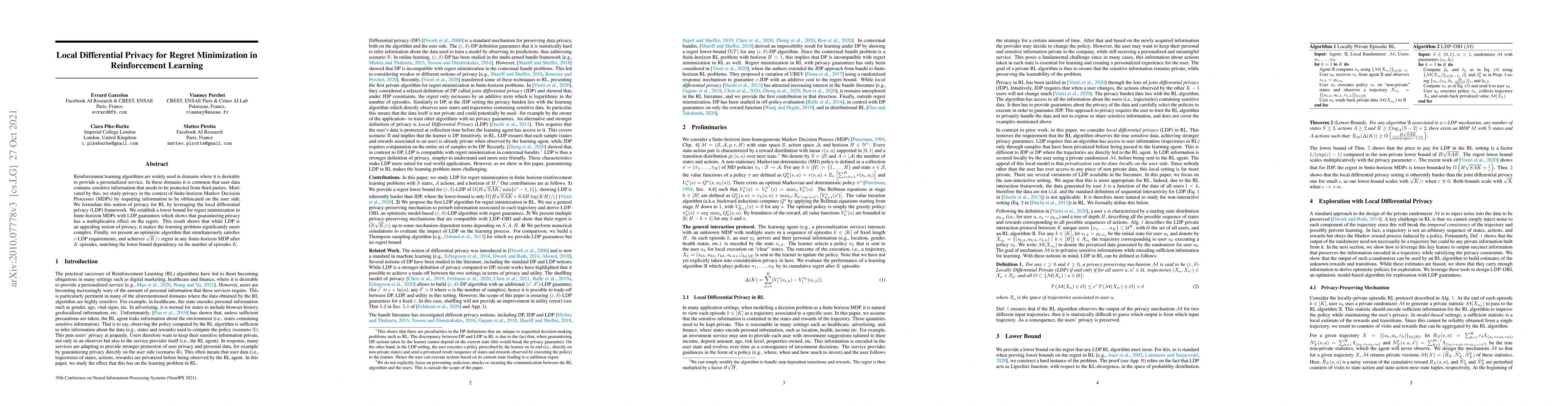 This paper explores local differential privacy (LDP) in reinforcement learning (RL) for personalized services, establishing a regret minimization lower bound that highlights the increased complexity of learning under privacy constraints. An optimistic algorithm is proposed that meets $\varepsilon$-LDP requirements and achieves optimal regret scaling.