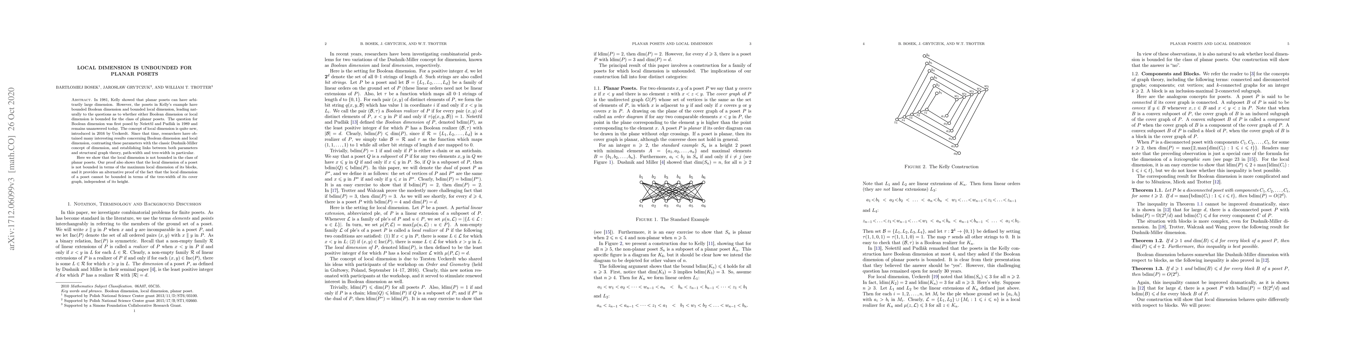 In 1981, Kelly showed that planar posets can have arbitrarily large dimension. However, the posets in Kelly's example have bounded Boolean dimension and bounded local dimension, leading naturally to the questions as to whether either Boolean dimension or local dimension is bounded for the class of planar posets. The question for Boolean dimension was first posed by Ne\v{s}et\v{r}il and Pudl\'ak in 1989 and remains unanswered today. The concept of local dimension is quite new, introduced in 2016 by Ueckerdt. Since that time, researchers have obtained many interesting results concerning Boolean dimension and local dimension, contrasting these parameters with the classic Dushnik-Miller concept of dimension, and establishing links between both parameters and structural graph theory, path-width, and tree-width in particular. Here we show that local dimension is not bounded on the class of planar posets. Our proof also shows that the local dimension of a poset is not bounded in terms of the maximum local dimension of its blocks, and it provides an alternative proof of the fact that the local dimension of a poset cannot be bounded in terms of the tree-width of its cover graph, independent of its height.