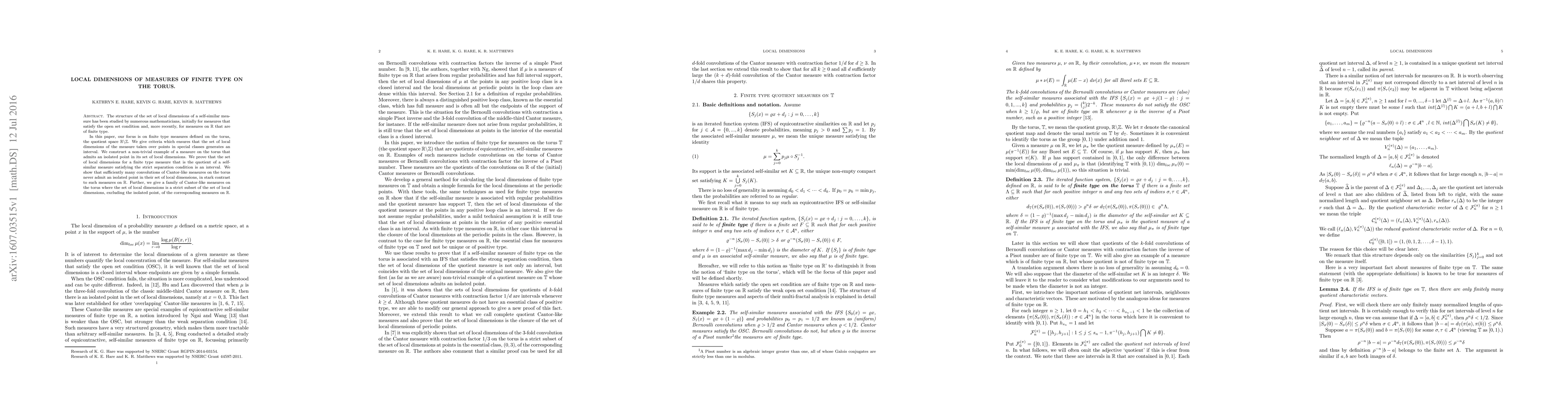 This paper explores the local dimensions of finite type measures on the torus, proving that under certain conditions, the set of local dimensions forms an interval. It also constructs a measure with an isolated point in its local dimension set and contrasts the behavior of convolutions of Cantor-like measures on the torus versus on $\mathbb{R}$.