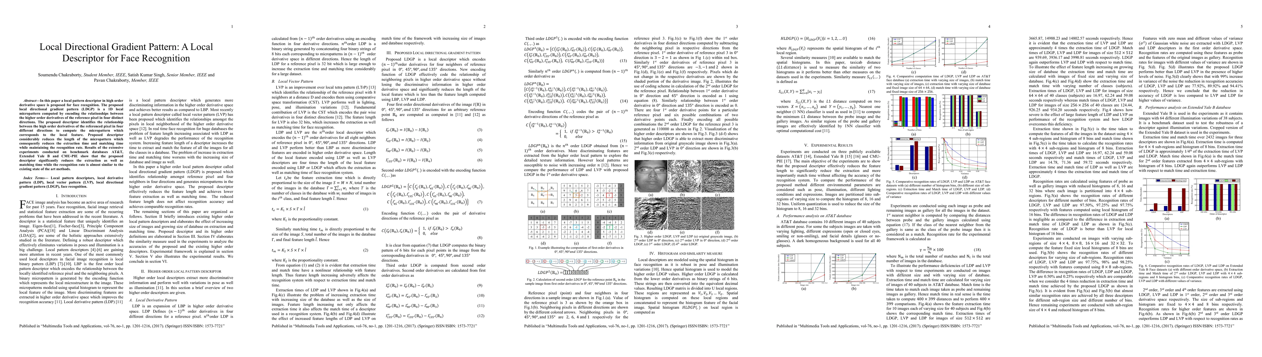 This paper introduces the Local Directional Gradient Pattern (LDGP), a new 1D local descriptor for face recognition that encodes high-order derivative relationships in four directions, significantly reducing extraction and matching time while maintaining high recognition rates. Experiments on benchmark databases show improved efficiency with comparable accuracy to state-of-the-art methods.
