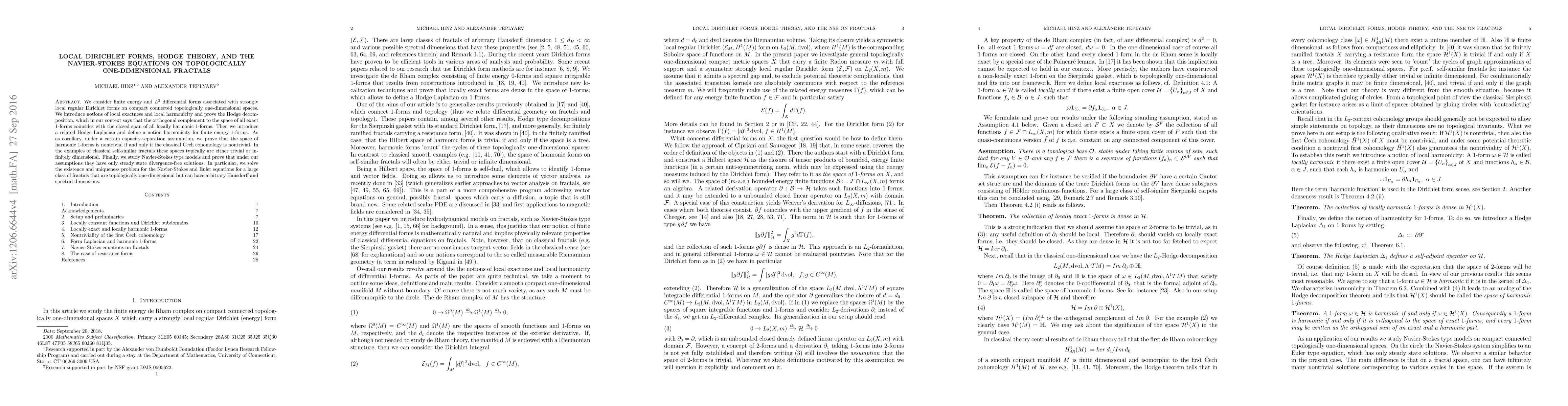 We consider finite energy and $L^2$ differential forms associated with strongly local regular Dirichlet forms on compact connected topologically one-dimensional spaces. We introduce notions of local exactness and local harmonicity and prove the Hodge decomposition, which in our context says that the orthogonal complement to the space of all exact 1-forms coincides with the closed span of all locally harmonic 1-forms. Then we introduce a related Hodge Laplacian and define a notion harmonicity for finite energy 1-forms. As as corollary, under a certain capacity-separation assumption, we prove that the space of harmonic 1-forms is nontrivial if and only if the classical \v{C}ech cohomology is nontrivial. In the examples of classical self-similar fractals these spaces typically are either trivial or infinitely dimensional. Finally, we study Navier-Stokes type models and prove that under our assumptions they have only steady state divergence-free solutions. In particular, we solve the existence and uniqueness problem for the Navier-Stokes and Euler equations for a large class of fractals that are topologically one-dimensional but can have arbitrary Hausdorff and spectral dimensions.
