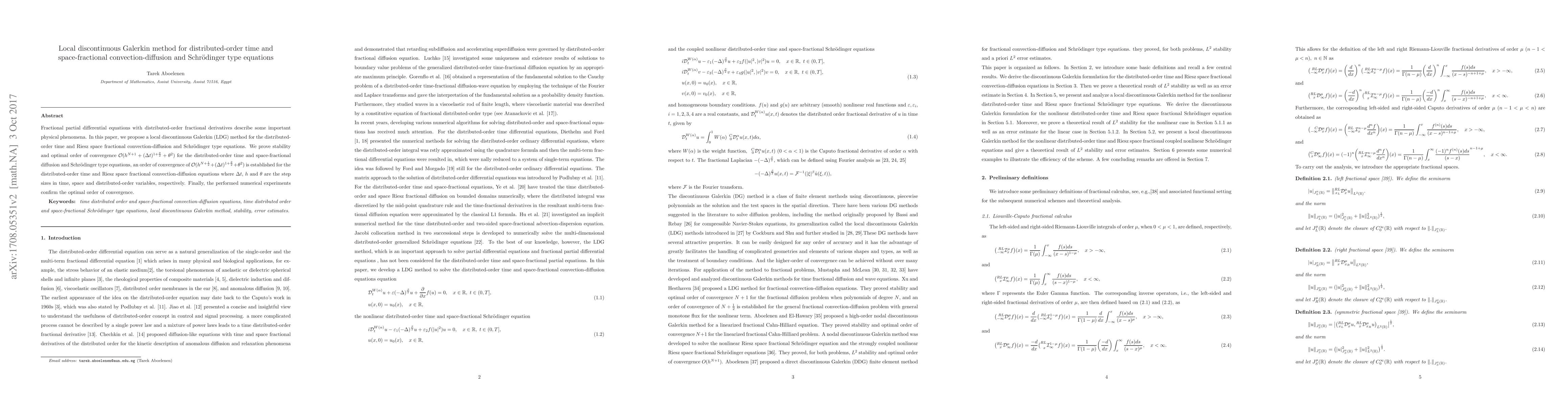 This paper proposes a local discontinuous Galerkin (LDG) method for solving distributed-order fractional convection-diffusion and Schrödinger type equations, proving stability and optimal convergence orders, and confirming these through numerical experiments.