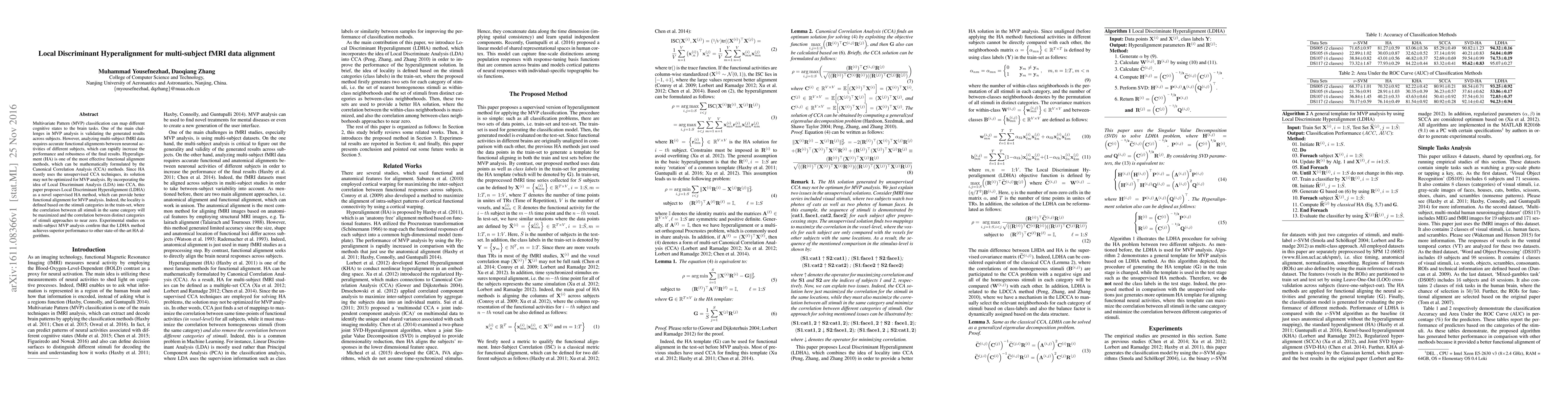 This paper proposes Local Discriminant Hyperalignment (LDHA), a novel supervised method that integrates Local Discriminant Analysis with Canonical Correlation Analysis for better functional alignment in multi-subject fMRI data. Experimental results show LDHA achieves superior performance in MVP analysis compared to other hyperalignment algorithms.