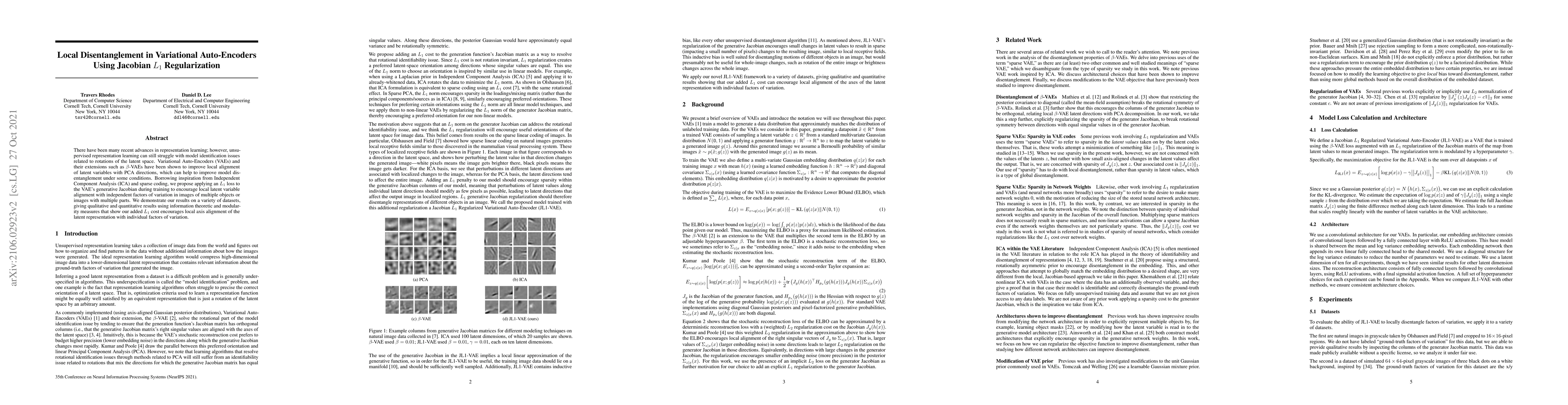 This paper proposes using $L_1$ regularization on the Jacobian of the VAE's generative model to improve local disentanglement of latent variables. The method encourages alignment with independent factors of variation, demonstrated through improved performance on various datasets.
