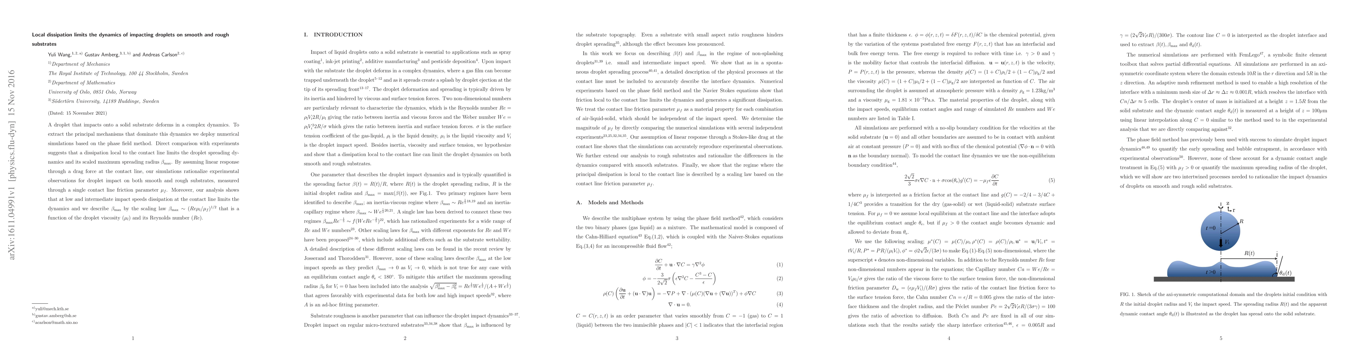 This paper uses numerical simulations to investigate how local dissipation at the contact line influences the dynamics of impacting droplets on both smooth and rough substrates. The findings suggest that local dissipation limits the droplet's spreading, described by a scaling law $\beta_\mathrm{max} \sim (Re \mu_\mathrm{l}/\mu_f)^{1/2}$, where $\mu_f$ is the contact line friction parameter.