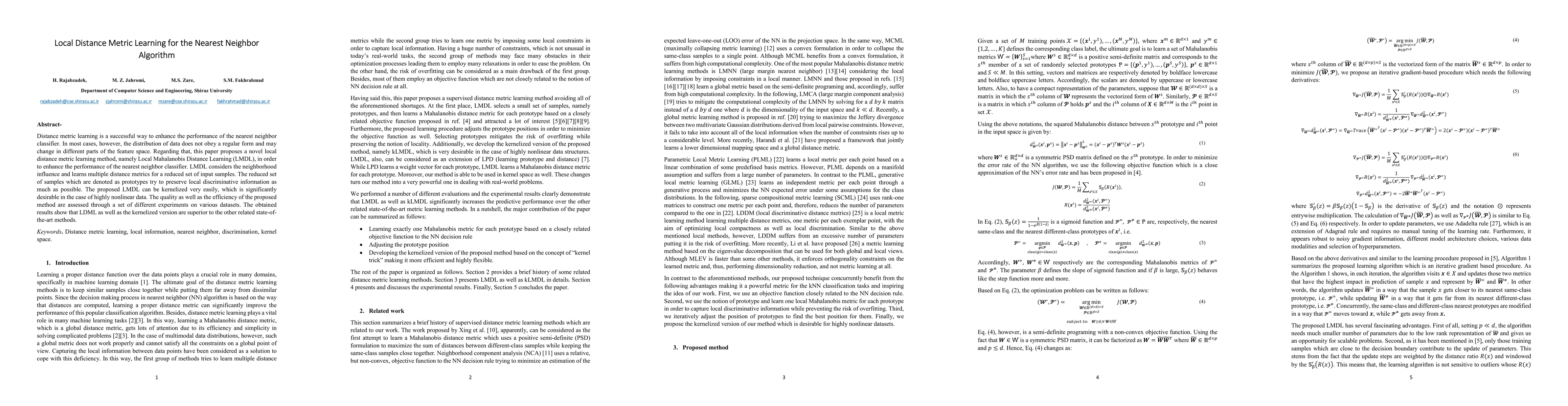 This paper introduces Local Mahalanobis Distance Learning (LMDL) to improve nearest neighbor classification by adapting to local data distributions. LMDL learns multiple distance metrics using a reduced set of prototypes, capturing local discriminative information, and can be easily kernelized for nonlinear data, outperforming other methods in experiments.
