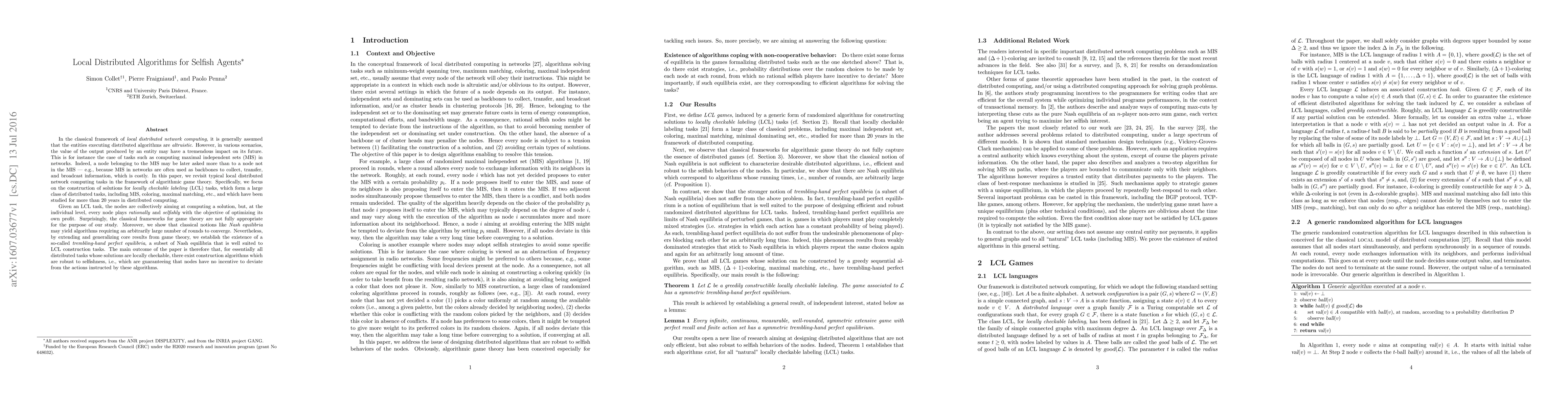 In the classical framework of local distributed network computing, it is generally assumed that the entities executing distributed algorithms are altruistic. However, in various scenarios, the value of the output produced by an entity may have a tremendous impact on its future. This is for instance the case of tasks such as computing maximal independent sets (MIS) in networks. Indeed, a node belonging to the MIS may be later asked more than to a node not in the MIS, e.g., because MIS in networks are often used as backbones to collect, transfer, and broadcast information, which is costly. In this paper, we revisit typical local distributed network computing tasks in the framework of algorithmic game theory. Specifically, we focus on the construction of solutions for locally checkable labeling (LCL) tasks, which form a large class of distributed tasks, including MIS, coloring, maximal matching, etc., and which have been studied for more than 20 years in distributed computing. Given an LCL task, the nodes are collectively aiming at computing a solution, but, at the individual level, every node plays rationally and selfishly with the objective of optimizing its own profit. Surprisingly, the classical frameworks for game theory are not fully appropriate for the purpose of our study. Moreover, we show that classical notions like Nash equilibria may yield algorithms requiring an arbitrarily large number of rounds to converge. Nevertheless, by extending and generalizing core results from game theory, we establish the existence of a so-called trembling-hand perfect equilibria, a subset of Nash equilibria that is well suited to LCL construction tasks. The main outcome of the paper is therefore that, for essentially all distributed tasks whose solutions are locally checkable, there exist construction algorithms which are robust to selfishness.