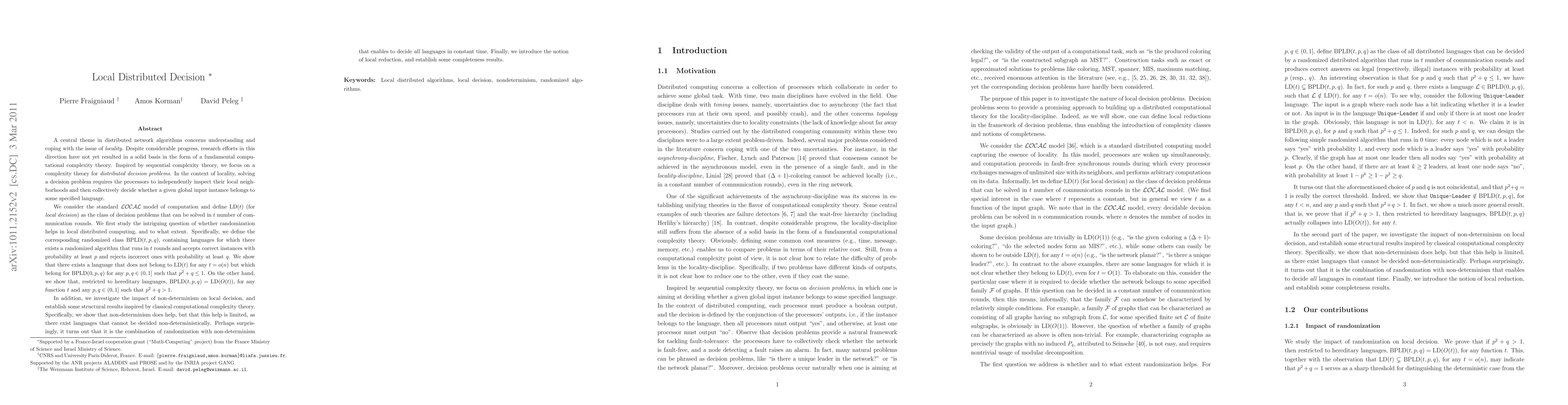 This research introduces a complexity theory for distributed decision problems, focusing on locality in the LOCAL model. It defines classes LD (constant rounds) and BPLD (randomized constant rounds), showing randomization doesn't aid for hereditary languages. The paper also presents nondeterministic class NLD with a complete problem, and class NLD#n containing all decidable languages with a natural complete problem.