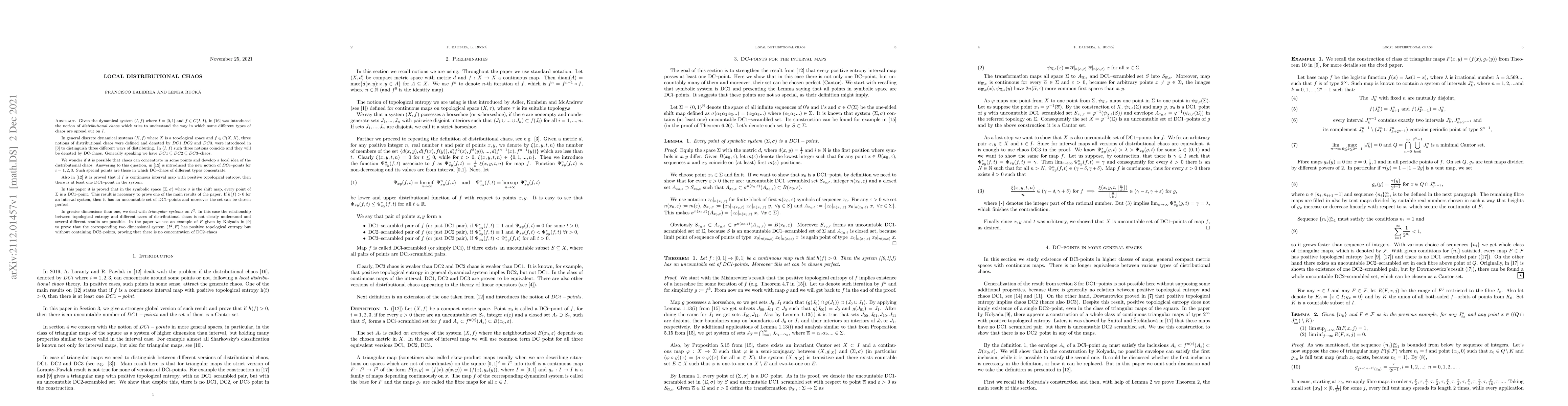 In discrete dynamical system $(X, f)$ where $X$ is a topological space and $f \in C(X,X)$, three notions of distributional chaos were defined. They were denoted by $DC1, DC2$ and $DC3$. For interval systems such three notions coincide and they will be denoted by DC-chaos. Generally speaking we have $DC1 \subseteq DC2 \subseteq DC3$-chaos. We wonder if it is possible that chaos can concentrate in some points and develop a local idea of the distributional chaos. Answering to this question, in [12] is introduced the new notion of $DCi$-points for $i = 1,2,3$. Such special points are those in which DC-chaos of different types concentrate. Also in [12] it is proved that if $f$ is continuous interval map with positive topological entropy, then there is at least one DC1-point in the system. In this paper it is proved that in the symbolic space $(\Sigma, \sigma) $ where $\sigma$ is the shift map, every point of $\Sigma$ is a DC1-point. This result is necessary to prove one of the main results of the paper. If $h(f) > 0 $ for an interval system, then it has an uncountable set of DC1-points and moreover the set can be chosen perfect. In greater dimensions than one, we deal with triangular systems on $I^{2}$. In this case the relationship between topological entropy and different cases of distributional chaos is not clearly understood and several different results are possible. In the paper we use an example of $F$ given by Kolyada in [9] to prove that the corresponding two dimensional system $(I^{2}, F)$ has positive topological entropy but without containing DC2-points, proving that there is no concentration of DC2-chaos