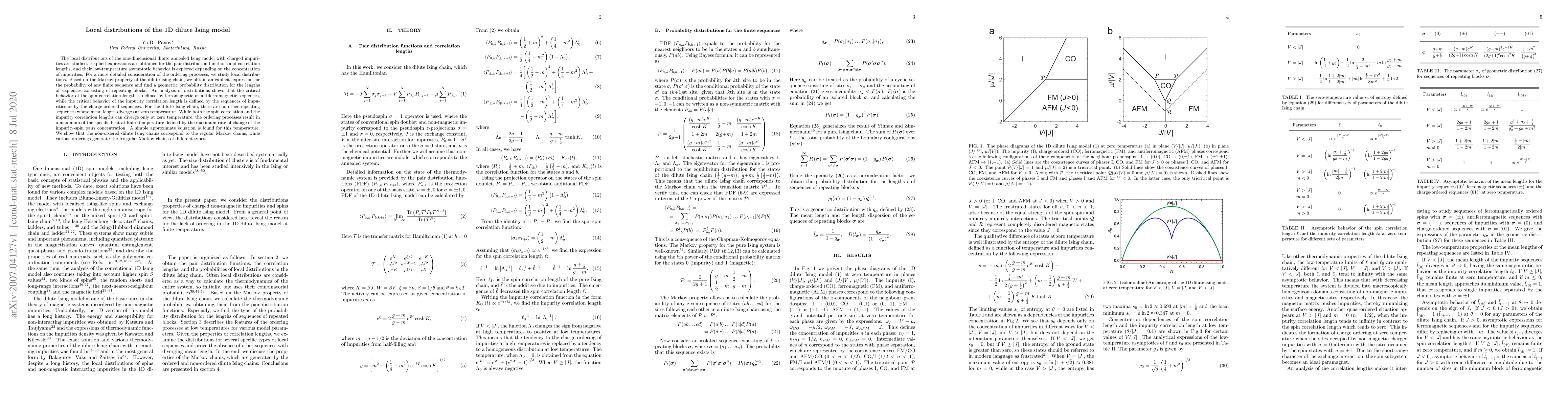 This paper studies the local distributions and correlation lengths of the 1D dilute Ising model with charged impurities, deriving explicit expressions for pair distribution functions and exploring their low-temperature behavior. It reveals that the critical behavior of spin and impurity correlation lengths is determined by specific sequence types and that the maximum specific heat occurs at a temperature defined by the impurity-spin pairs concentration change rate.