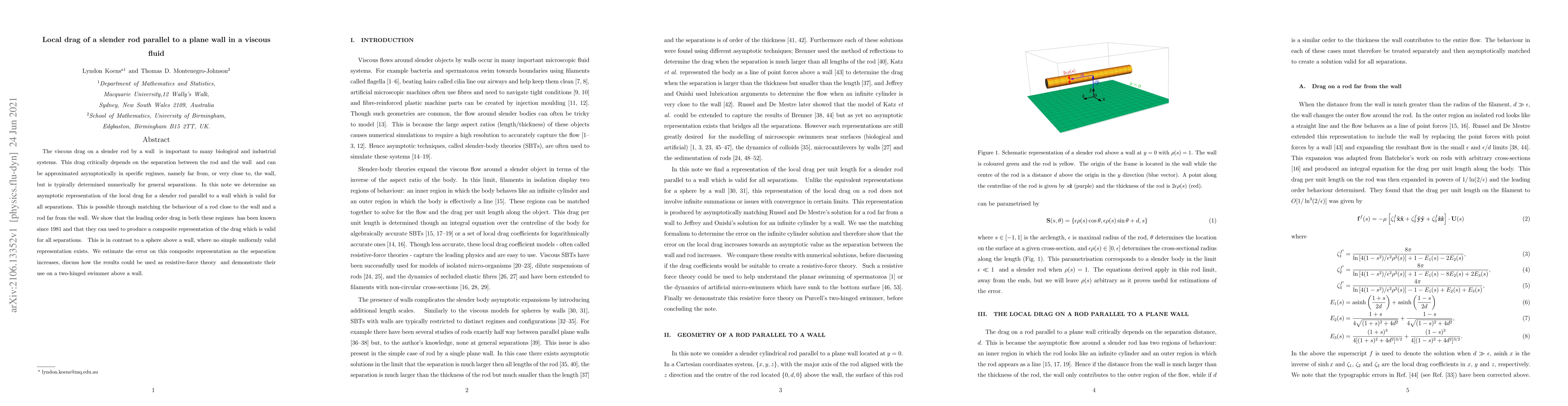 This paper develops an asymptotic representation for the viscous drag on a slender rod parallel to a plane wall, valid across all separation distances, by matching known regimes far from and close to the wall. The results provide a composite drag model and estimate its error for practical applications, such as modeling a two-hinged swimmer.