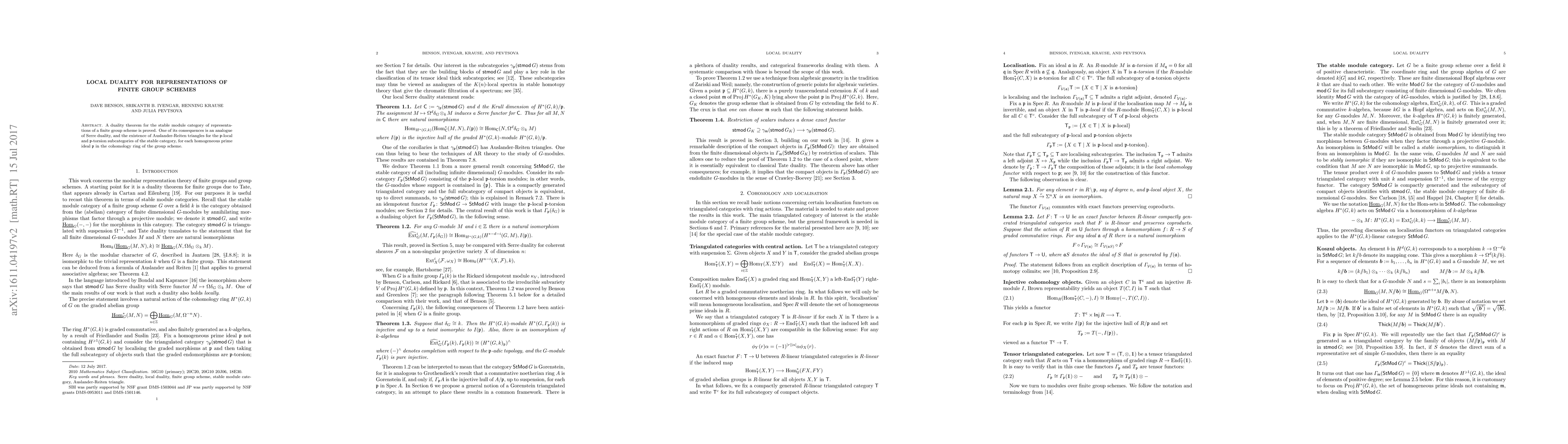 The paper establishes a duality theorem for the stable module category of finite group schemes, leading to an analogue of Serre duality and Auslander-Reiten triangles for $\mathfrak{p}$-local and $\mathfrak{p}$-torsion subcategories associated with homogeneous prime ideals in the cohomology ring.