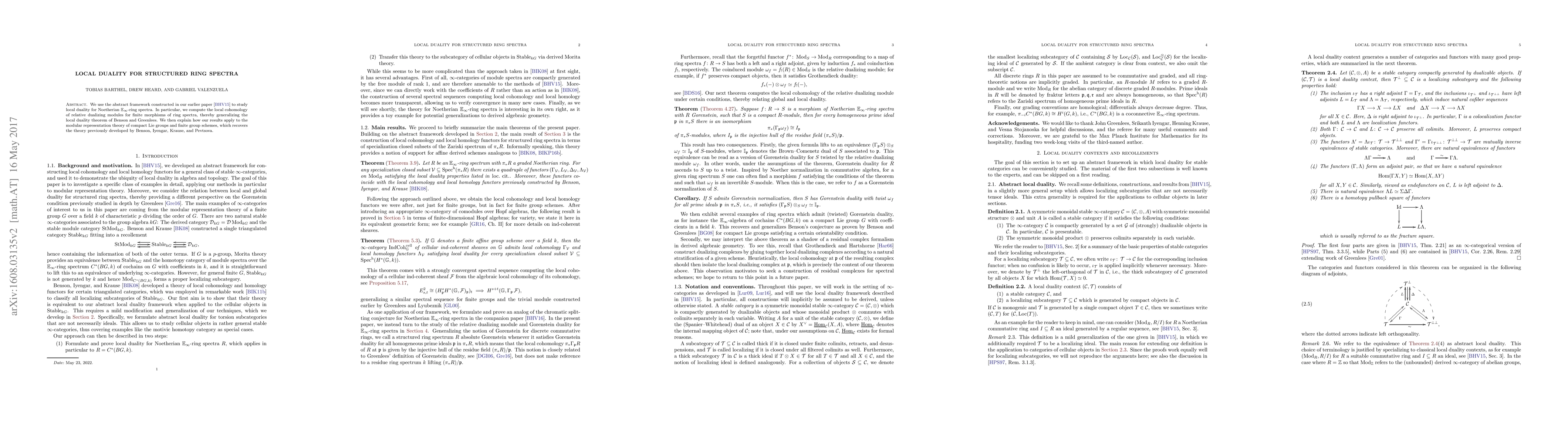 We use the abstract framework constructed in our earlier paper to study local duality for Noetherian $\mathbb{E}_{\infty}$-ring spectra. In particular, we compute the local cohomology of relative dualizing modules for finite morphisms of ring spectra, thereby generalizing the local duality theorem of Benson and Greenlees. We then explain how our results apply to the modular representation theory of compact Lie groups and finite group schemes, which recovers the theory previously developed by Benson, Iyengar, Krause, and Pevtsova.