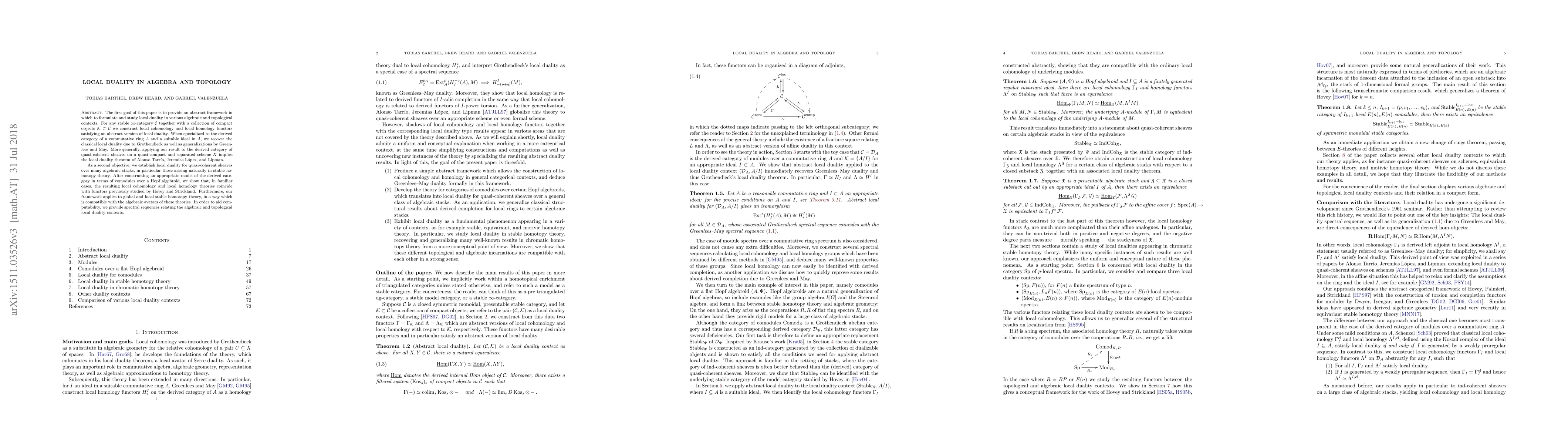 The first goal of this paper is to provide an abstract framework in which to formulate and study local duality in various algebraic and topological contexts. For any stable $\infty$-category $\mathcal{C}$ together with a collection of compact objects $\mathcal{K} \subset \mathcal{C}$ we construct local cohomology and local homology functors satisfying an abstract version of local duality. When specialized to the derived category of a commutative ring $A$ and a suitable ideal in $A$, we recover the classical local duality due to Grothendieck as well as generalizations by Greenlees and May. More generally, applying our result to the derived category of quasi-coherent sheaves on a quasi-compact and separated scheme $X$ implies the local duality theorem of Alonso Tarr\'io, Jerem\'ias L\'opez, and Lipman. As a second objective, we establish local duality for quasi-coherent sheaves over many algebraic stacks, in particular those arising naturally in stable homotopy theory. After constructing an appropriate model of the derived category in terms of comodules over a Hopf algebroid, we show that, in familiar cases, the resulting local cohomology and local homology theories coincide with functors previously studied by Hovey and Strickland. Furthermore, our framework applies to global and local stable homotopy theory, in a way which is compatible with the algebraic avatars of these theories. In order to aid computability, we provide spectral sequences relating the algebraic and topological local duality contexts.