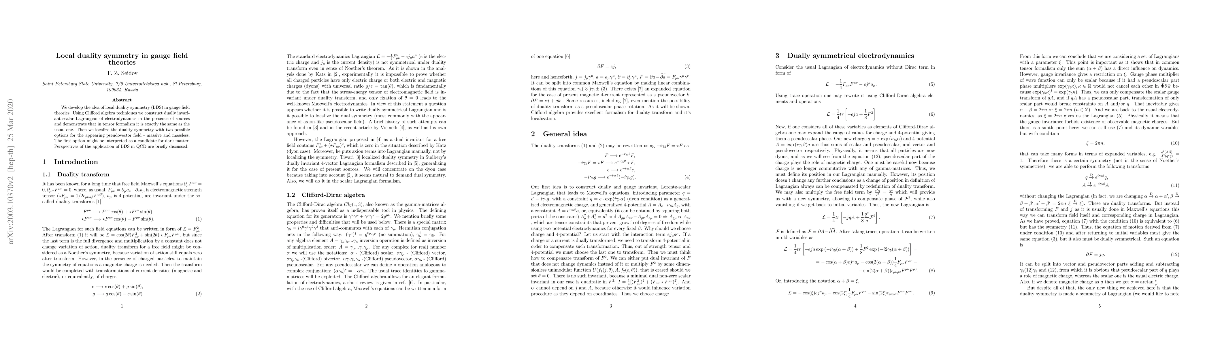 This paper introduces local duality symmetry in gauge field theories, constructing a dually invariant Lagrangian for electrodynamics using Clifford algebra. It explores two localization options for a pseudovector field, with one potential dark matter candidate, and briefly discusses applications in QCD.