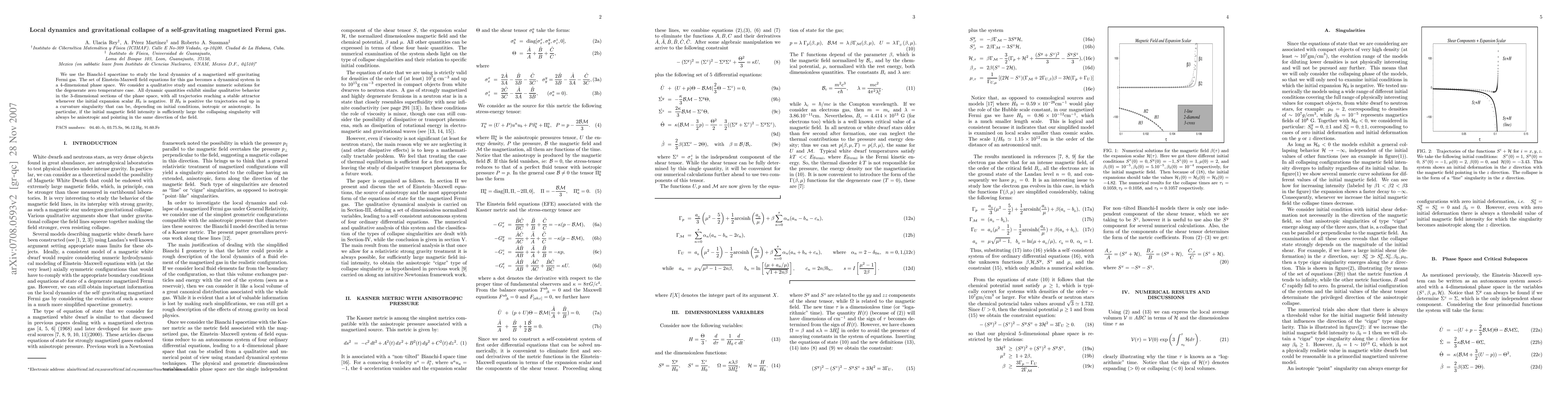We use the Bianchi-I spacetime to study the local dynamics of a magnetized self-gravitating Fermi gas. The set of Einstein-Maxwell field equations for this gas becomes a dynamical system in a 4-dimensional phase space. We consider a qualitative study and examine numeric solutions for the degenerate zero temperature case. All dynamic quantities exhibit similar qualitative behavior in the 3-dimensional sections of the phase space, with all trajectories reaching a stable attractor whenever the initial expansion scalar H_{0} is negative. If H_{0} is positive, and depending on initial conditions, the trajectories end up in a curvature singularity that could be isotropic(singular "point") or anisotropic (singular "line"). In particular, for a sufficiently large initial value of the magnetic field it is always possible to obtain an anisotropic type of singularity in which the "line" points in the same direction of the field.