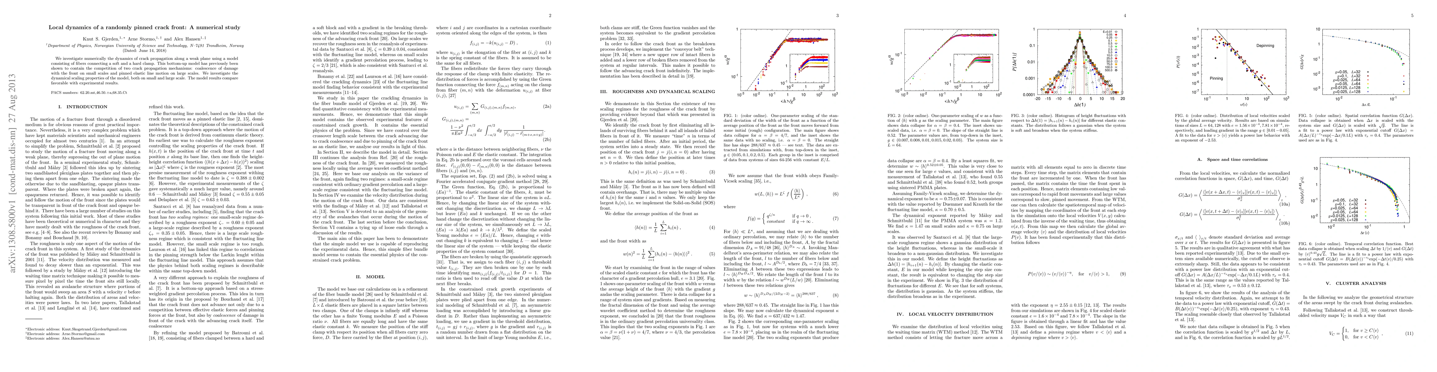 We investigate numerically the dynamics of crack propagation along a weak plane using a model consisting of fibers connecting a soft and a hard clamp. This bottom-up model has previously been shown to contain the competition of two crack propagation mechanisms: coalescence of damage with the front on small scales and pinned elastic line motion on large scales. We investigate the dynamical scaling properties of the model, both on small and large scale. The model results compare favorable with experimental results.