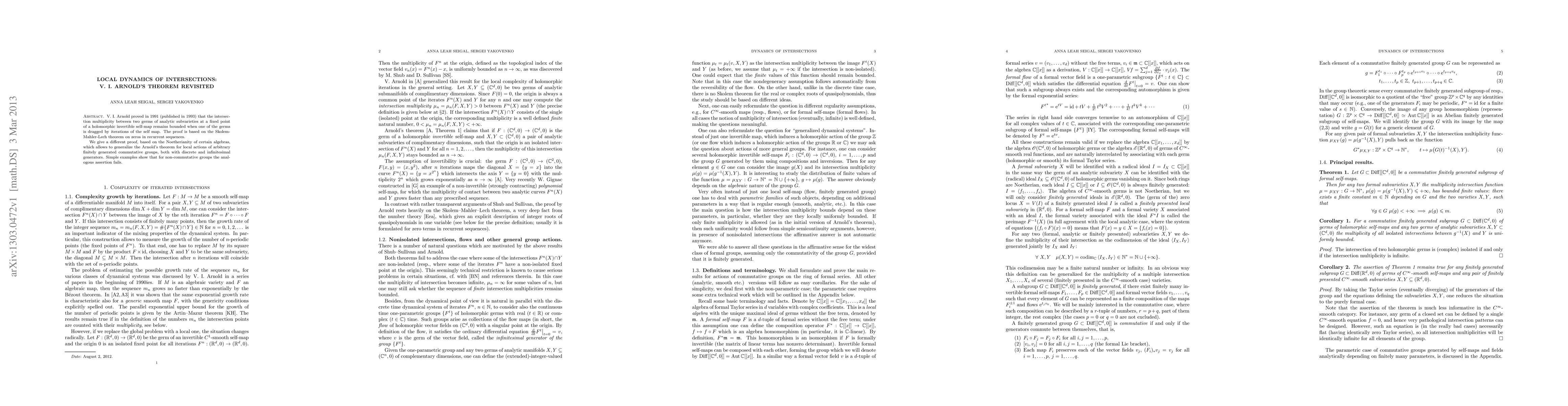 V. I. Arnold proved in 1991 (published in 1993) that the intersection multiplicity between two germs of analytic subvarieties at a fixed point of a holomorphic invertible self-map remains bounded when one of the germs is dragged by iterations of the self map. The proof is based on the Skolem-Mahler-Lech theorem on zeros in recurrent sequences. We give a different proof, based on the Noetherianity of certain algebras, which allows to generalize the Arnold's theorem for local actions of arbitrary finitely generated commutative groups, both with discrete and infinitesimal generators. Simple examples show that for non-commutative groups the analogous assertion fails.