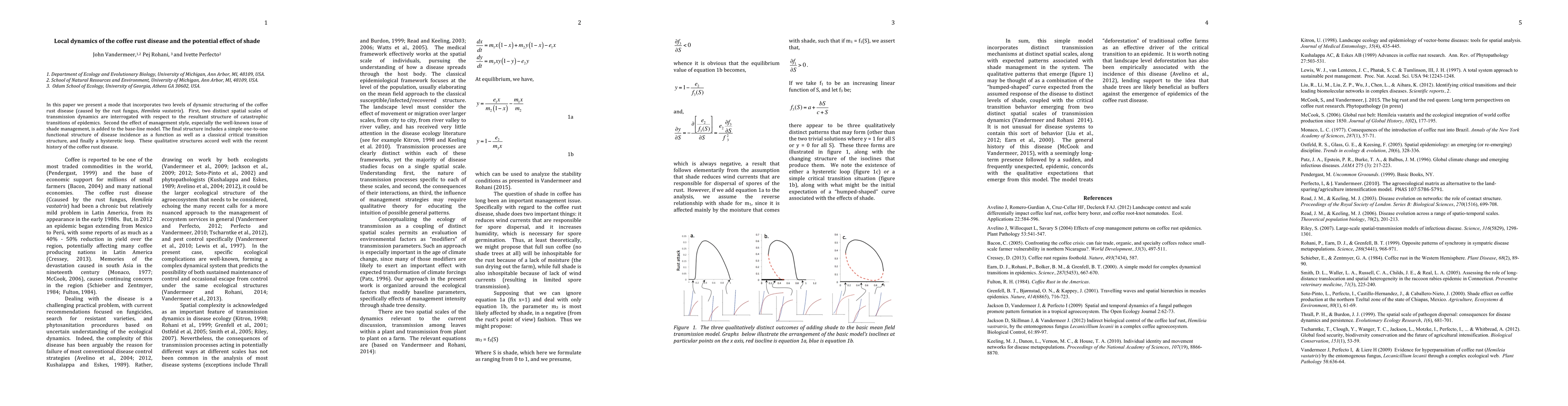 This paper develops a model to analyze the local dynamics of coffee rust disease, focusing on two spatial scales of transmission and incorporating the impact of shade management. The model reveals critical transitions and hysteretic loops in disease incidence, aligning with historical patterns of the disease.