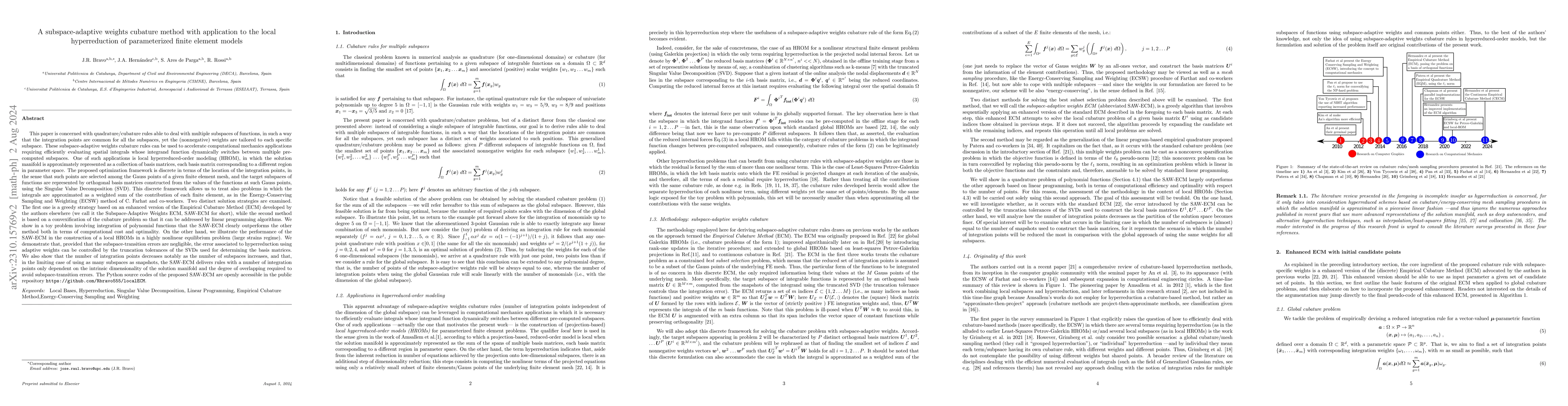 The Local Empirical Cubature Method (Local-ECM) is an innovative algorithm designed to generate efficient integration rules for local reduced-order models, optimizing cubature rules to achieve sparsity with minimal implementation overhead. The method outperforms existing global strategies and LP approaches, as demonstrated through three academic examples.