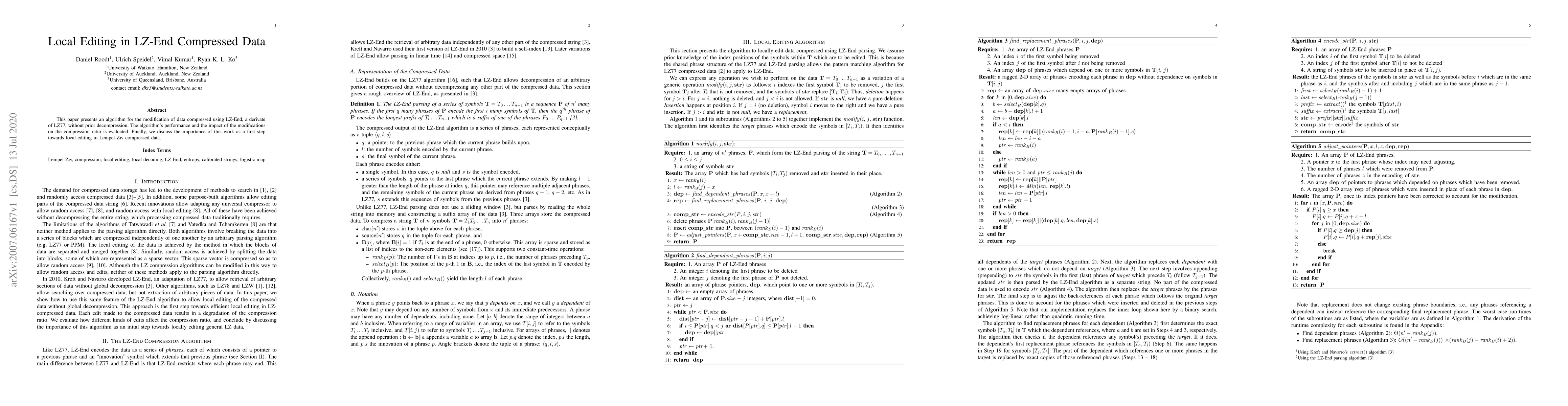This paper introduces an algorithm for modifying LZ-End compressed data directly without decompression, evaluating its performance and the impact on compression ratio. The work marks an initial step towards enabling local editing in Lempel-Ziv compressed data.