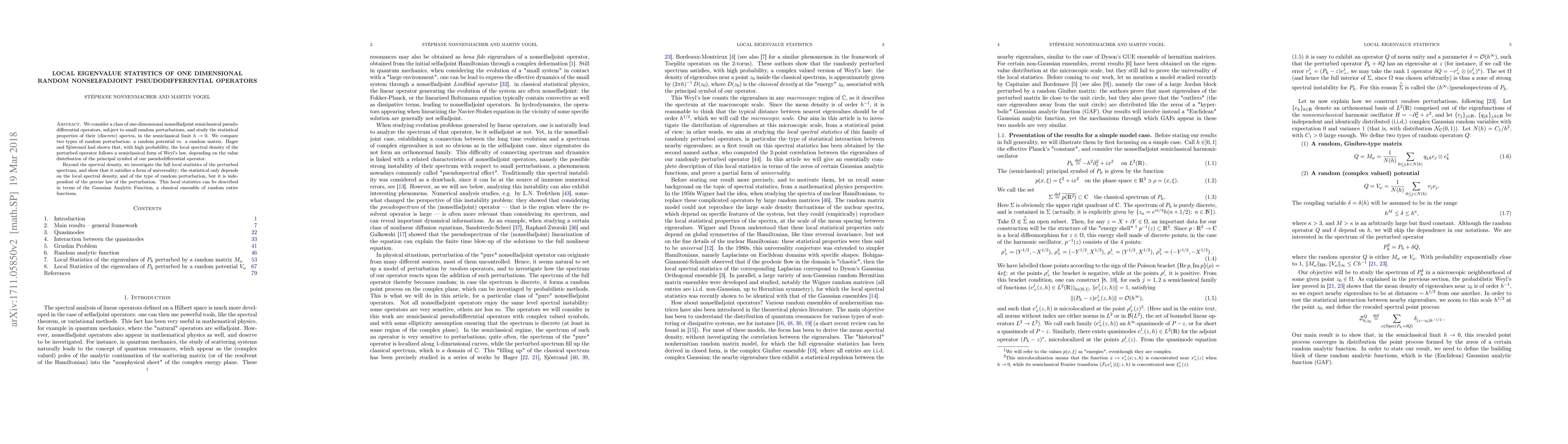 This paper examines the statistical properties of the spectra of one-dimensional random non-selfadjoint pseudo-differential operators in the semiclassical limit. It demonstrates that the local statistics of the perturbed spectrum exhibit universality, depending only on the local spectral density and the type of random perturbation, and is described by the Gaussian Analytic Function.