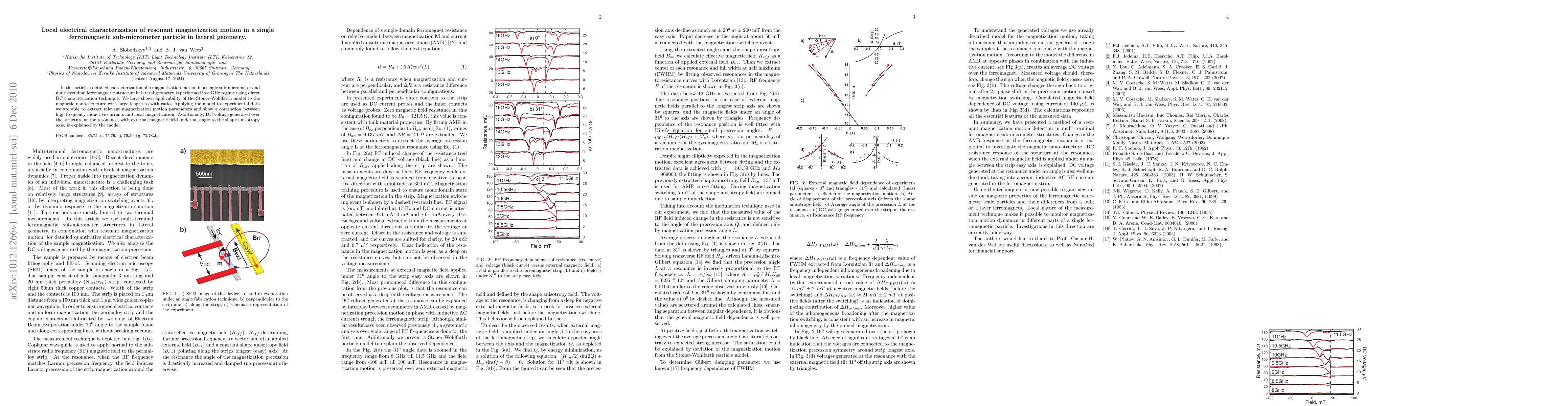 In this article a detailed characterization of a magnetization motion in a single sub-micrometer and multi-terminal ferromagnetic structure in lateral geometry is performed in a GHz regime using direct DC characterization technique. We have shown applicability of the Stoner-Wohlfarth model to the magnetic nano-structure with large length to with ratio. Applying the model to experimental data we are able to extract relevant magnetization motion parameters and show a correlation between high frequency inductive currents and local magnetization. Additionally, DC voltage generated over the structure at the resonance, with external magnetic field under an angle to the shape anisotropy axis, is explained by the model.