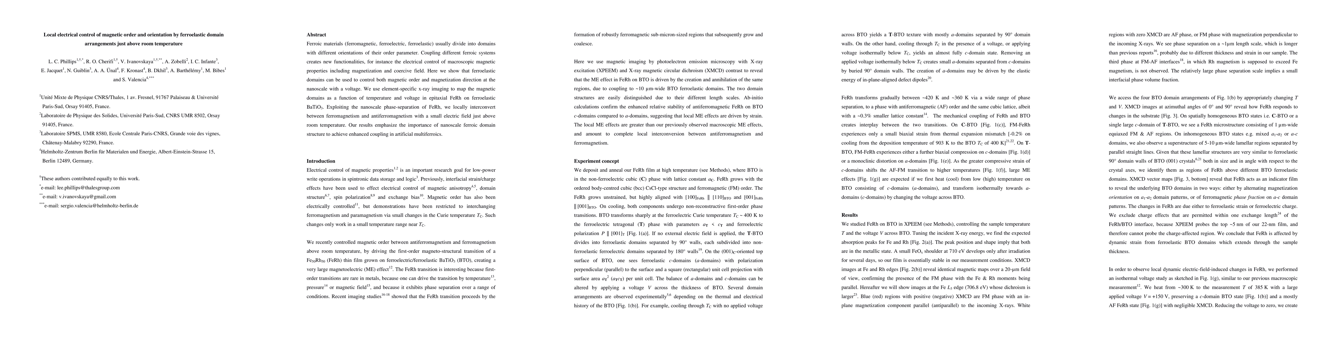 This paper demonstrates the electrical control of magnetic order and orientation in ferroelastic domains using epitaxial FeRh on ferroelastic BaTiO3. By applying voltage just above room temperature, nanoscale ferroic domain arrangements enable the interconversion between ferromagnetism and antiferromagnetism, highlighting the significance of domain structure in multiferroic materials.