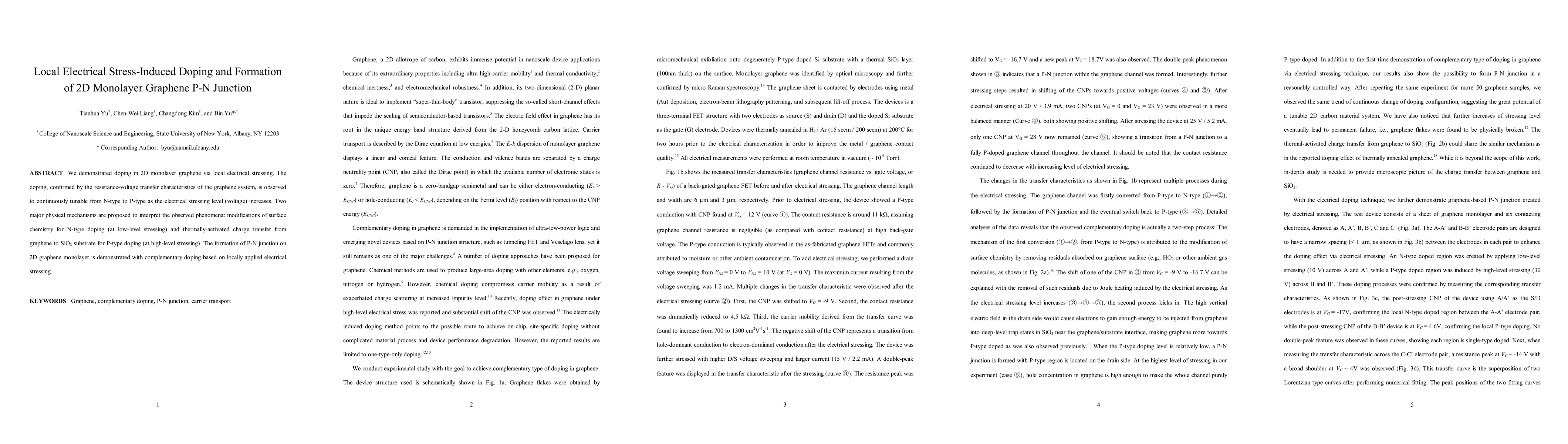 This paper demonstrates local electrical stress-induced doping in 2D monolayer graphene, showing continuous tunability from N-type to P-type. The study proposes two mechanisms: surface chemistry changes for N-type and thermally-activated charge transfer for P-type, and successfully forms a P-N junction via complementary doping.