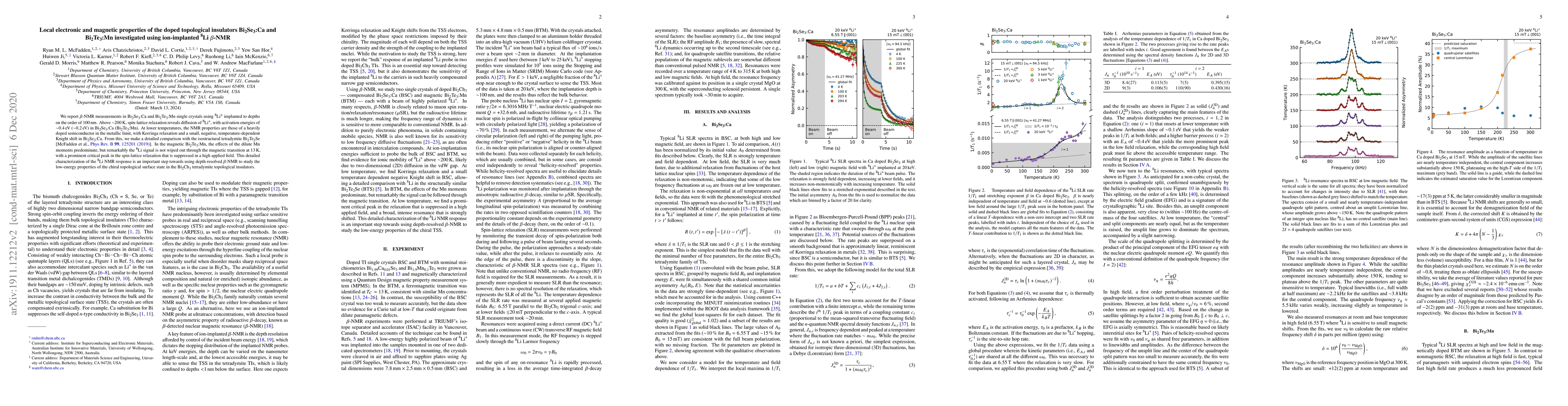 This paper investigates the local electronic and magnetic properties of doped topological insulators Bi$_{2}$Se$_{3}$:Ca and Bi$_{2}$Te$_{3}$:Mn using $\beta$-detected nuclear magnetic resonance (NMR) with ion-implanted $^{8}$Li. The study reveals diffusion of $^{8}$Li$^{+}$ and distinct NMR behavior in the metallic limit, with a critical peak in spin-lattice relaxation indicating the presence of Mn moments in Bi$_{2}$Te$_{3}$:Mn.