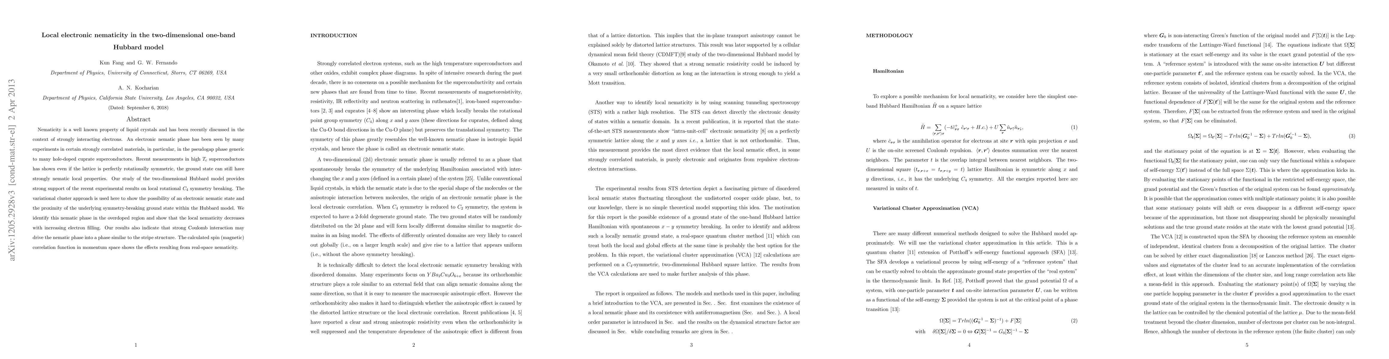 Nematicity is a well known property of liquid crystals and has been recently discussed in the context of strongly interacting electrons. An electronic nematic phase has been seen by many experiments in certain strongly correlated materials, in particular, in the pseudogap phase generic to many hole-doped cuprate superconductors. Recent measurements in high $T_c$ superconductors has shown even if the lattice is perfectly rotationally symmetric, the ground state can still have strongly nematic local properties. Our study of the two-dimensional Hubbard model provides strong support of the recent experimental results on local rotational $C_4$ symmetry breaking. The variational cluster approach is used here to show the possibility of an electronic nematic state and the proximity of the underlying symmetry-breaking ground state within the Hubbard model. We identify this nematic phase in the overdoped region and show that the local nematicity decreases with increasing electron filling. Our results also indicate that strong Coulomb interaction may drive the nematic phase into a phase similar to the stripe structure. The calculated spin (magnetic) correlation function in momentum space shows the effects resulting from real-space nematicity.