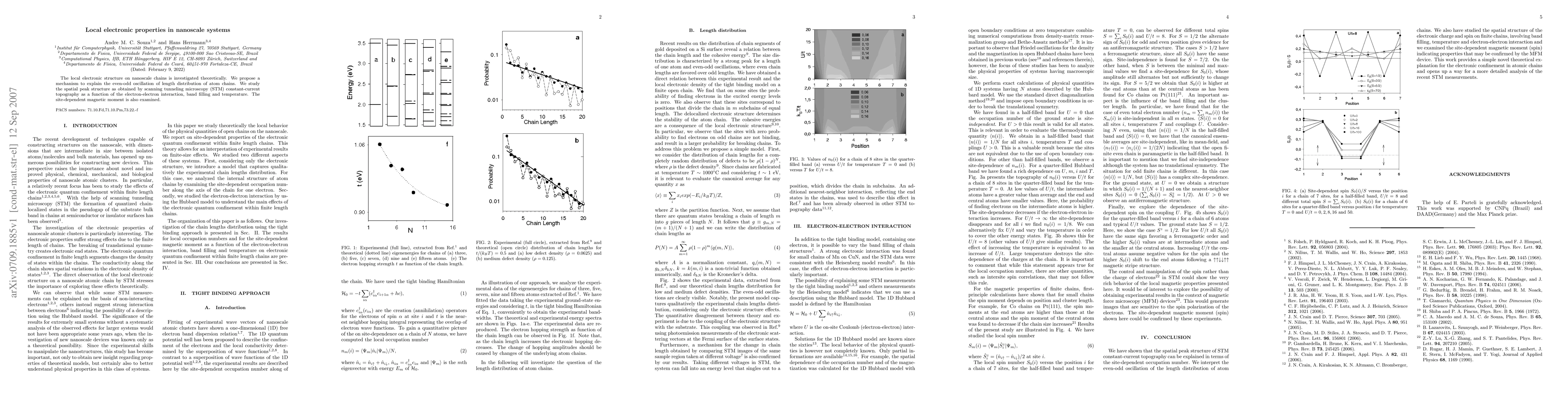 This paper theoretically investigates the local electronic structure in nanoscale chains, proposing a mechanism for the observed even-odd oscillation in chain length distribution. It examines spatial peak structures via scanning tunneling microscopy, considering electron-electron interaction, band filling, and temperature effects, and analyzes site-dependent magnetic moments.