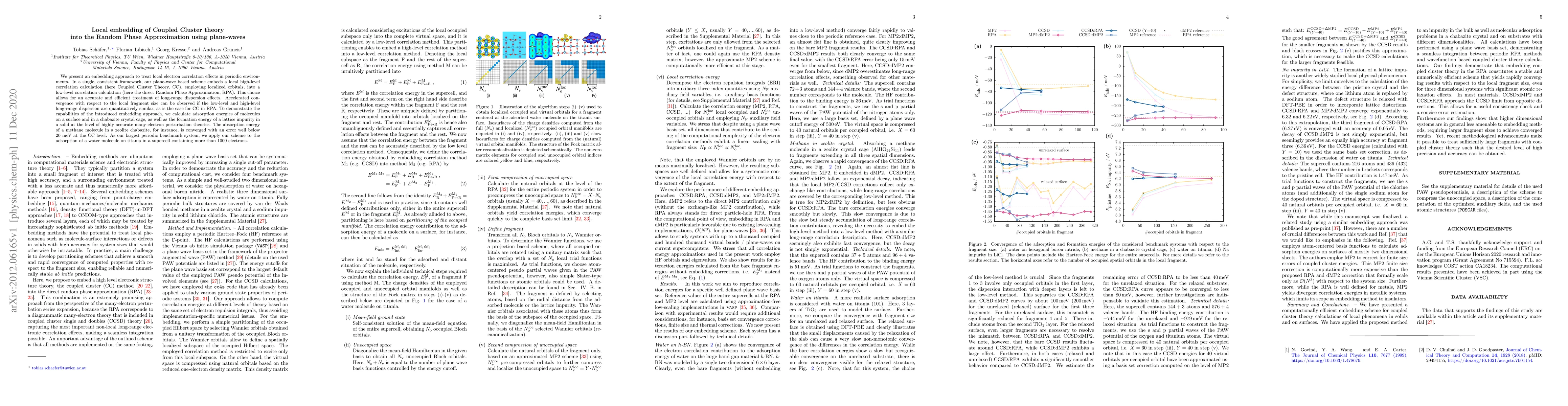 We present an embedding approach to treat local electron correlation effects in periodic environments. In a single, consistent framework, our plane-wave based scheme embeds a local high-level correlation calculation (here Coupled Cluster Theory, CC), employing localized orbitals, into a low-level correlation calculation (here the direct Random Phase Approximation, RPA). This choice allows for an accurate and effcient treatment of long-range dispersion effects. Accelerated convergence with respect to the local fragment size can be observed if the low-level and high-level long-range dispersion are quantitatively similar, as is the case for CC in RPA. To demonstrate the capabilities of the introduced embedding approach, we calculate adsorption energies of molecules on a surface and in a chabazite crystal cage, as well as the formation energy of a lattice impurity in a solid at the level of highly accurate many-electron perturbation theories. The absorption energy of a methane molecule in a zeolite chabazite, for instance, is converged with an error well below 20 meV at the CC level. As our largest periodic benchmark system, we apply our scheme to the adsorption of a water molecule on titania in a supercell containing more than 1000 electrons.